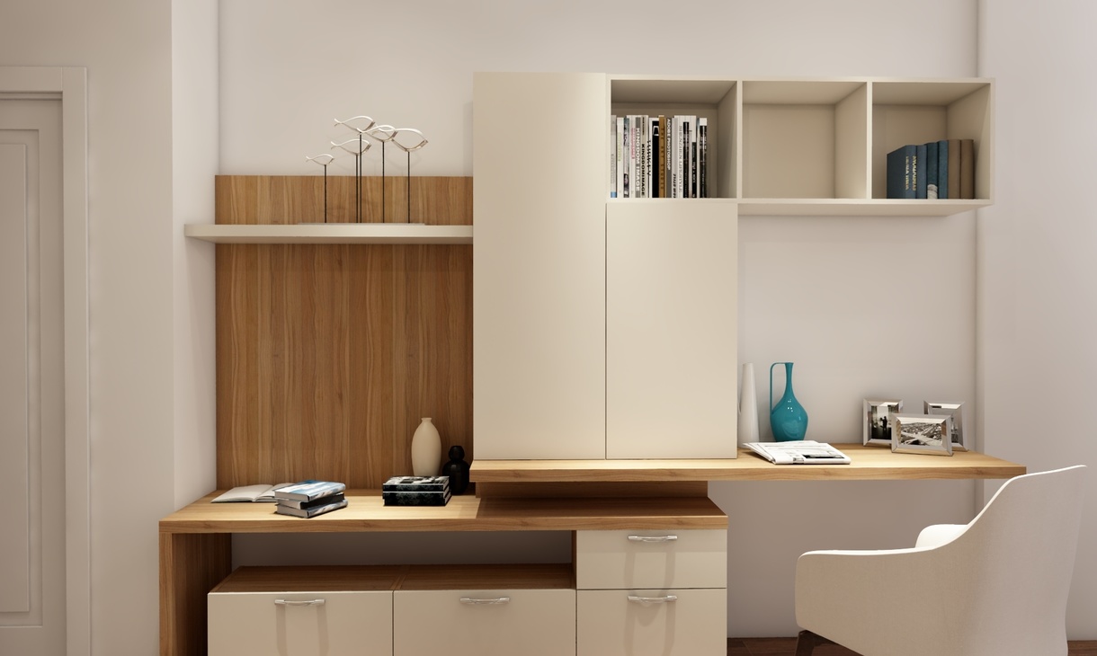 次臥:定制的書桌柜體線條簡約流暢,而床上的枕頭顏色與客廳呼應,使整體風格簡單舒適的同時增添溫馨氣氛。