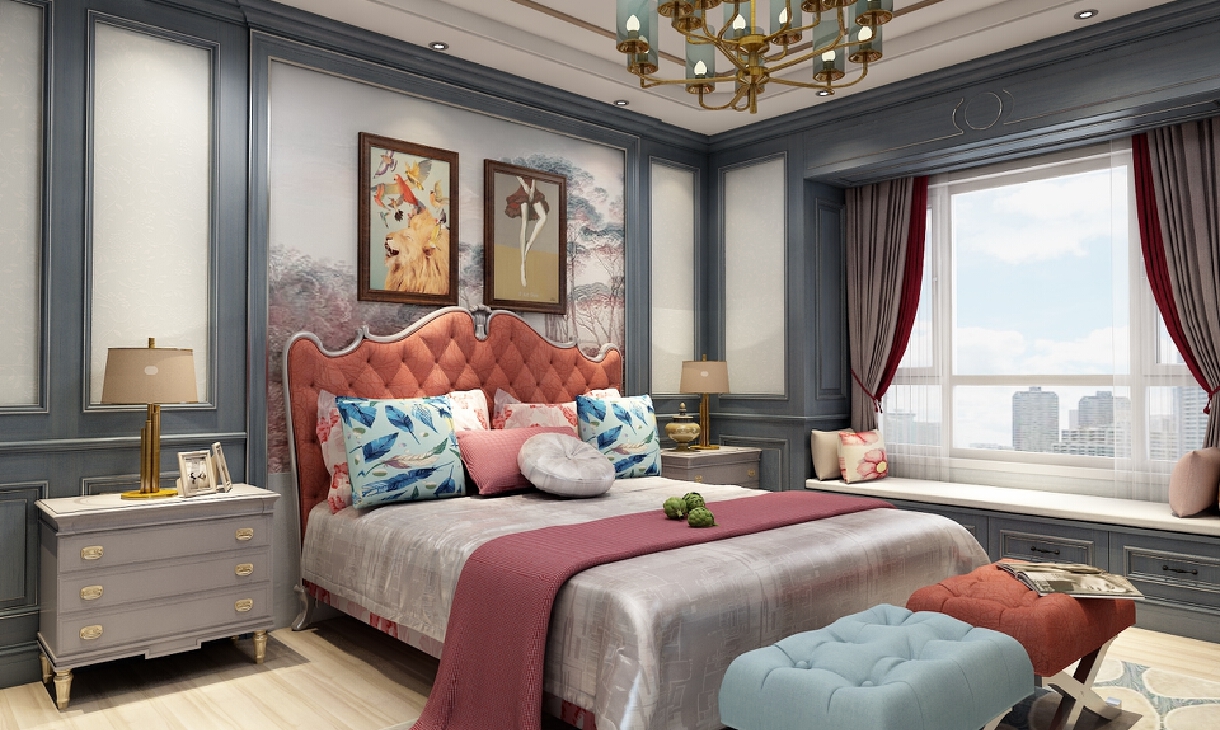 本案是一套三室兩廳的戶型,其風格定位為:“美式風格”,但整套方案的設計上又與傳統的美式有所區別,首先在顏色選用上主色調任是具有現代審美的灰調子,而輔色、點綴色上選擇藍與艷麗的暖色調形成了冷暖對比,使整個空間層次分明,更能“吸人眼球”。其次本案最大亮點要數整個木作體系,極具個性化的產品、虛實結合、時而對立時而統一。最后在軟裝搭配上,主要選擇高檔次的皮革與布藝面料.....,給原本有著強烈對比的空間,增加幾分家的溫馨與舒適之感,也是整個空間承上啟下、畫龍點睛之處。