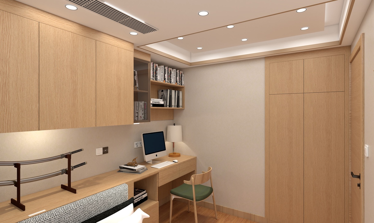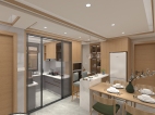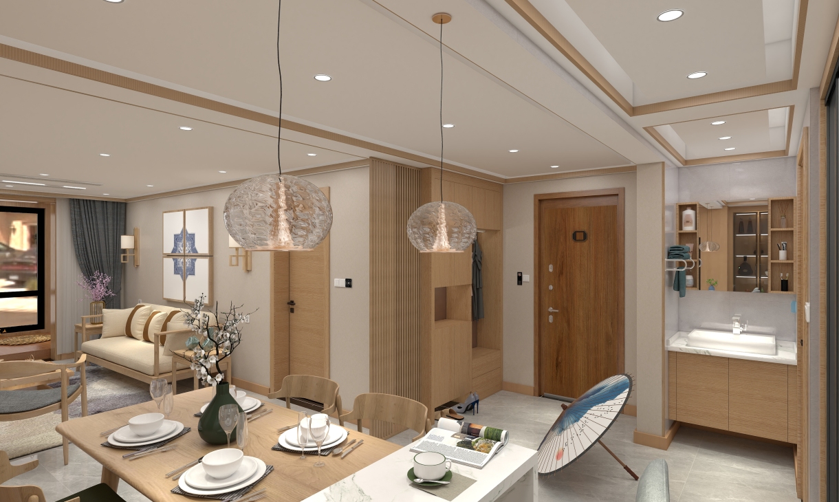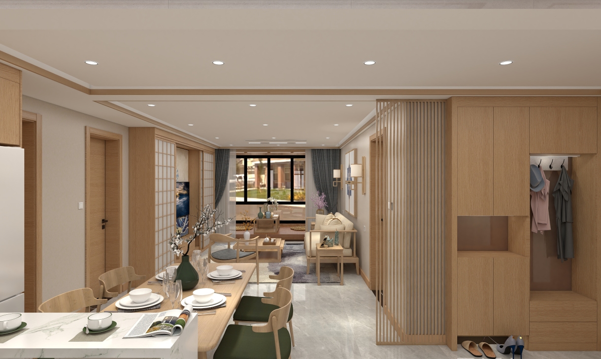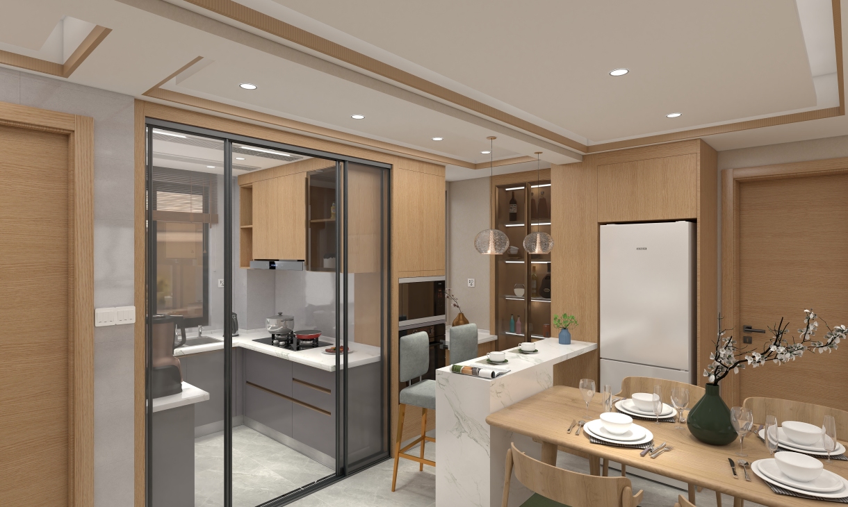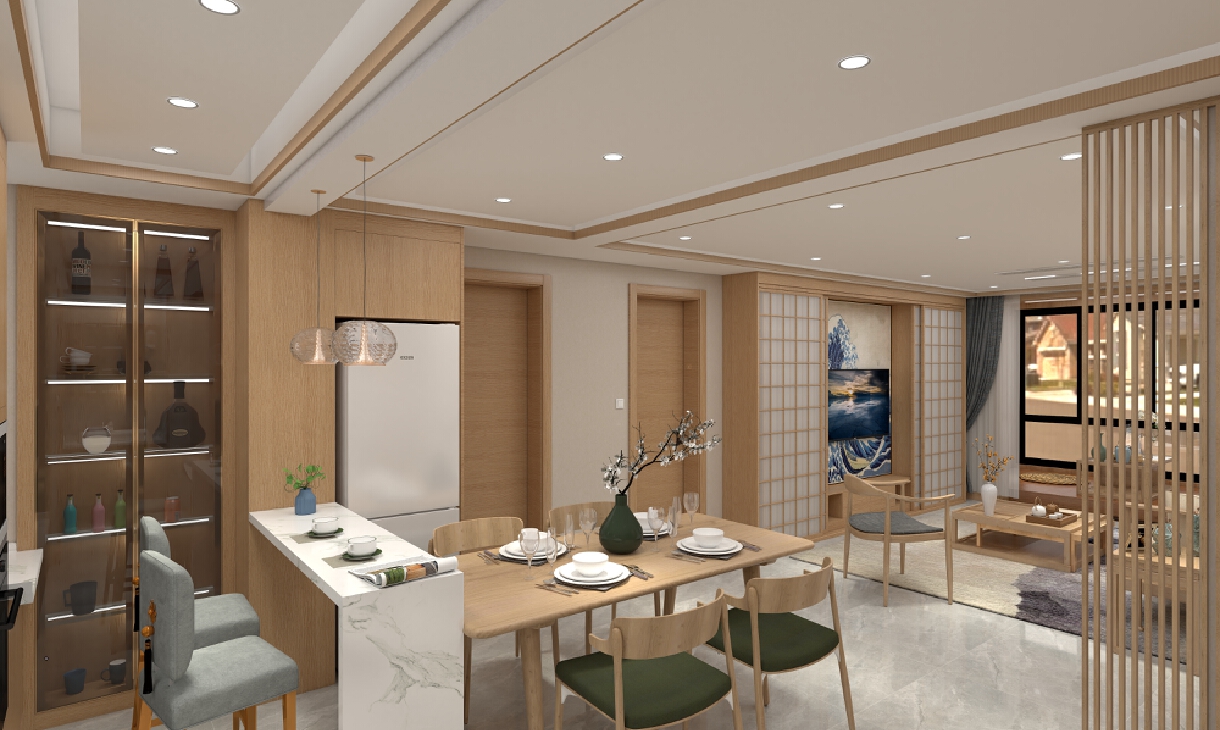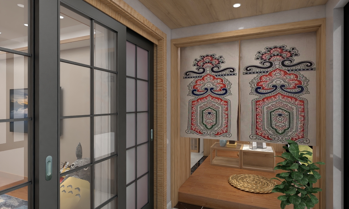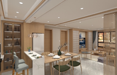業(yè)主是一對(duì)年輕的夫妻,想要有足夠的儲(chǔ)物空間,硬裝盡量簡(jiǎn)化,不喜歡太多做作的裝飾。經(jīng)過(guò)多次溝通,最終確定了日式裝修風(fēng)格。 在大的方向上,整個(gè)裝修以原木色為主,返璞歸真。廚房地柜選擇灰色,打破空間里原木色帶來(lái)的沉悶感。餐廳里利用高柜將冰箱包住,冰箱與酒柜之間的柱子利用木飾面包住,并且利用柱子位置還作出了吧臺(tái),這樣餐廳里就多出了一個(gè)很有格調(diào)的酒吧。 在陽(yáng)臺(tái)上利用富有日式感的門簾將生活陽(yáng)臺(tái)與休閑陽(yáng)臺(tái)隔開(kāi)。生活陽(yáng)臺(tái)雖然位于西南次臥室一邊,但是客戶還是希望少曬衣服,盡量不要影響采光,于是洗衣機(jī)選擇了洗烘一體的。休閑陽(yáng)臺(tái)位于客廳一邊,地面抬高15公分,鋪上地板,放上茶臺(tái),周末休閑時(shí)光與愛(ài)人一起品茗觀景,也是極好不過(guò)的。
