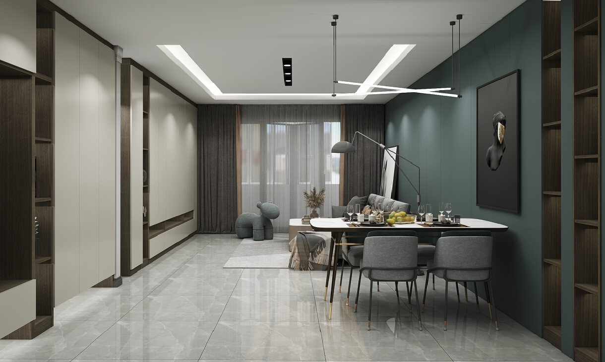 客餐廳一體,用柜體作為電視機背景墻,摒棄客廳放電視機的傳統,改為使用投影儀,更加現代摩登符合當代年輕人的生活方式
