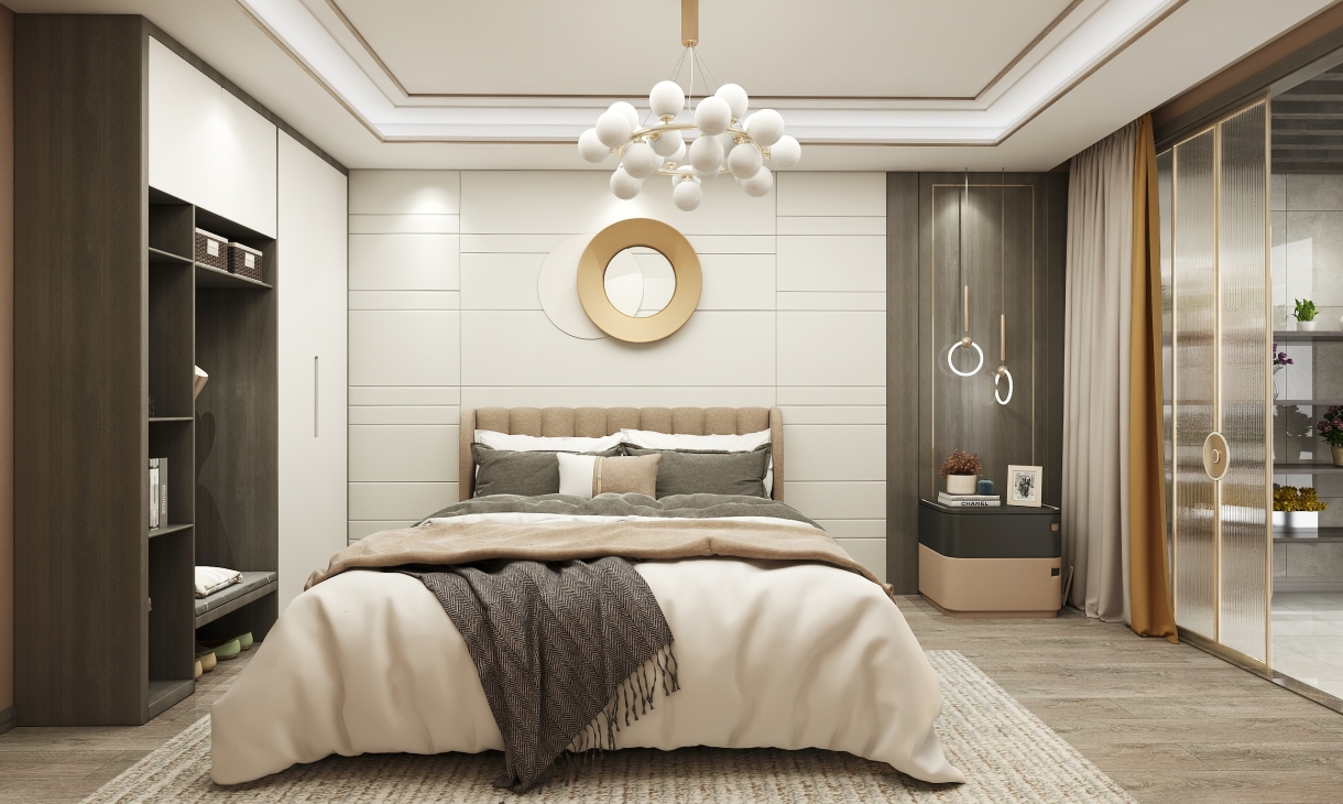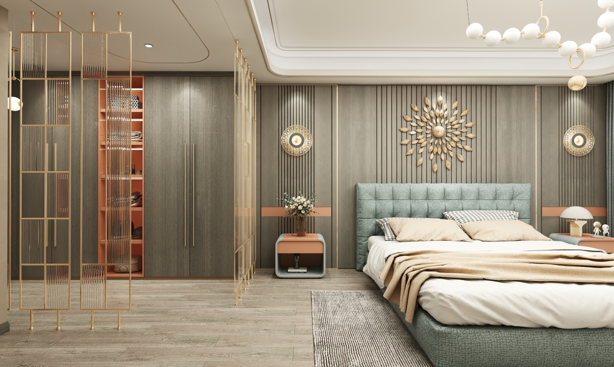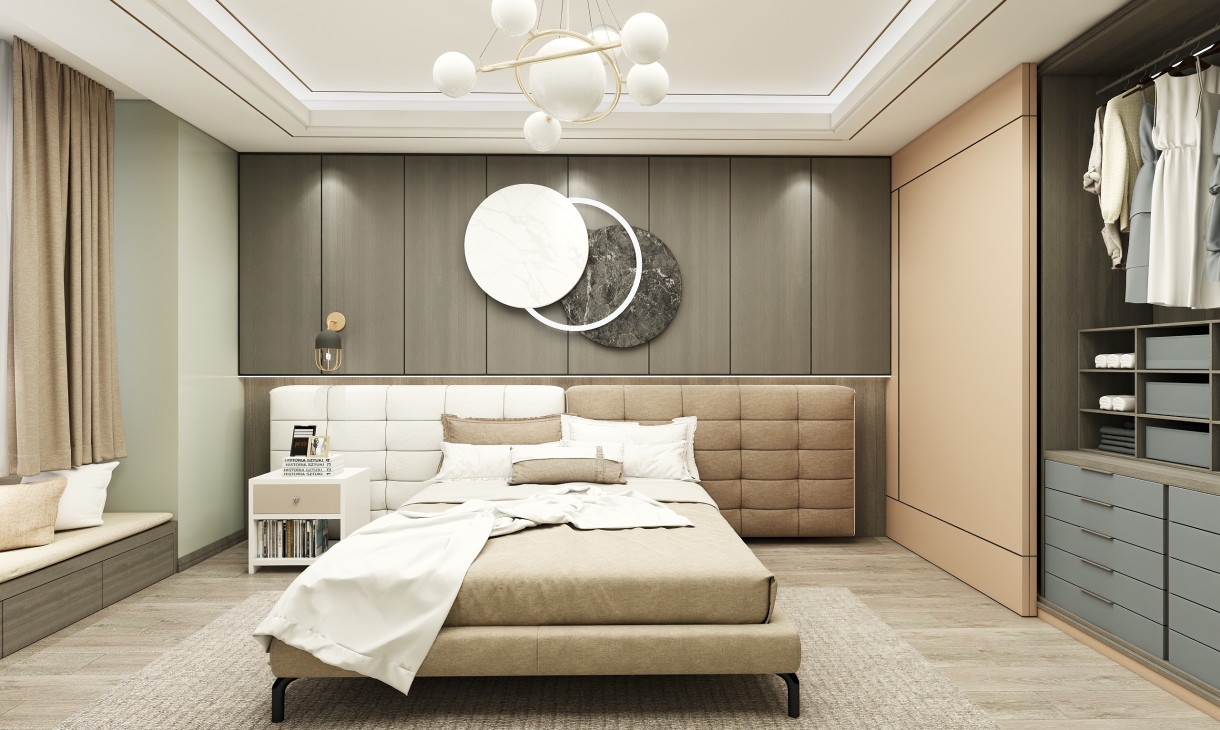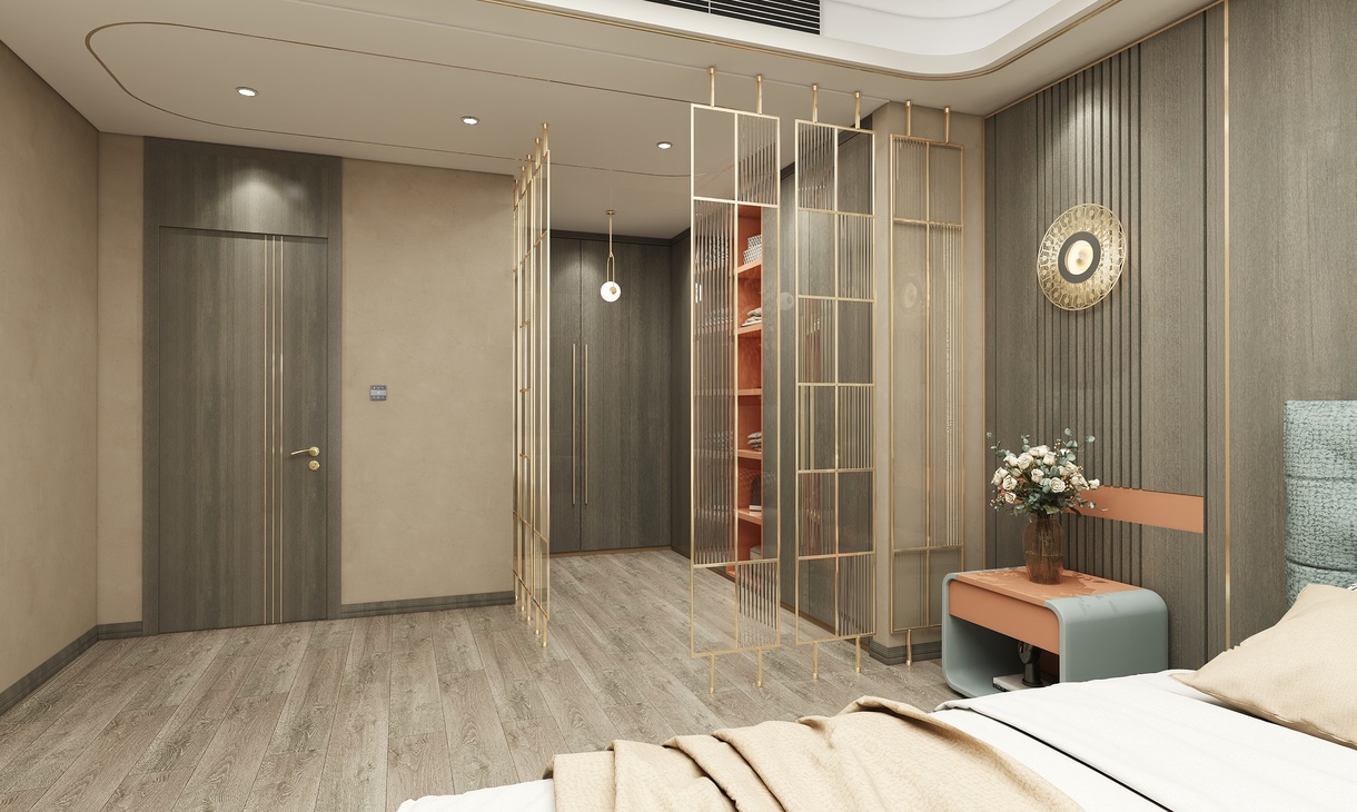 臥室的設(shè)計(jì)風(fēng)格和色調(diào)都是輕奢為主,這兩者都是圍繞這款輕奢風(fēng)格來設(shè)計(jì)的,讓簡單的生活盡顯品質(zhì)。臥室的床頭背景做了木飾面的設(shè)計(jì),把睡眠空間的延續(xù)性發(fā)揮到淋漓盡致。