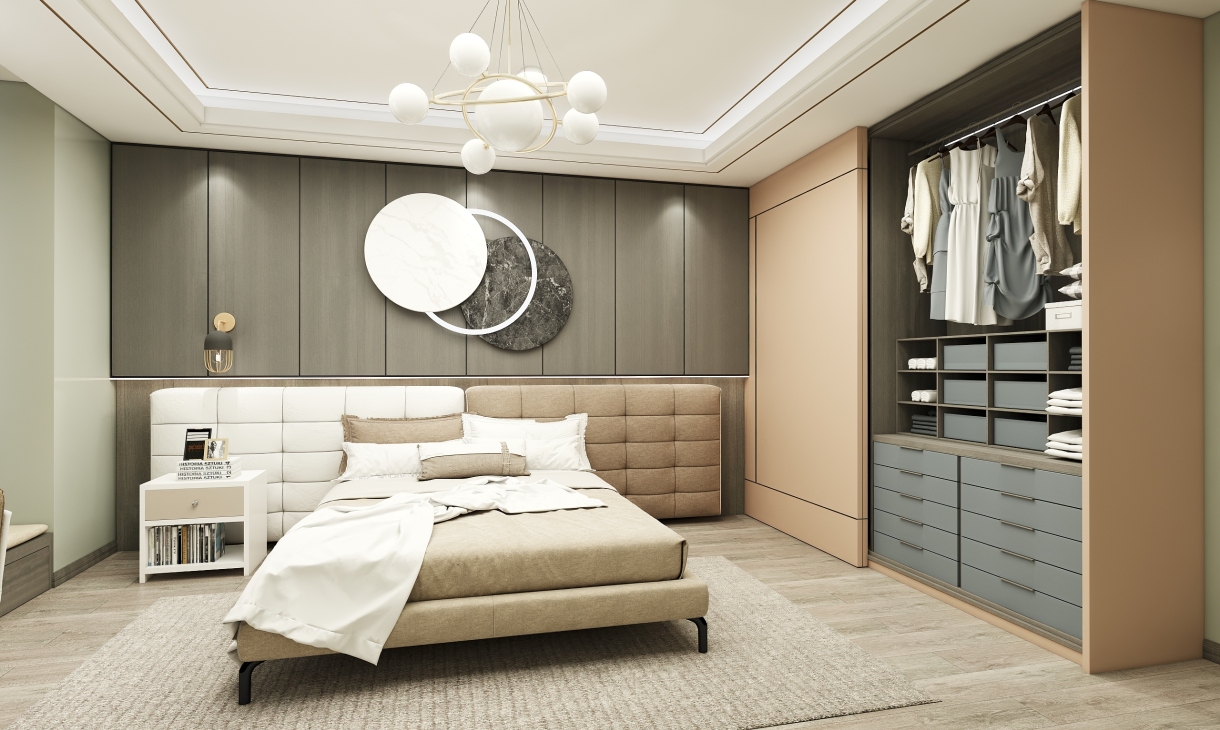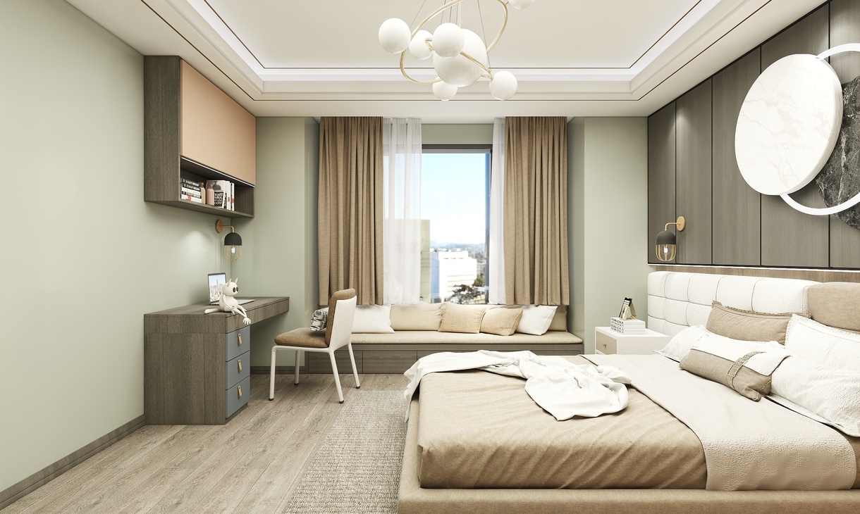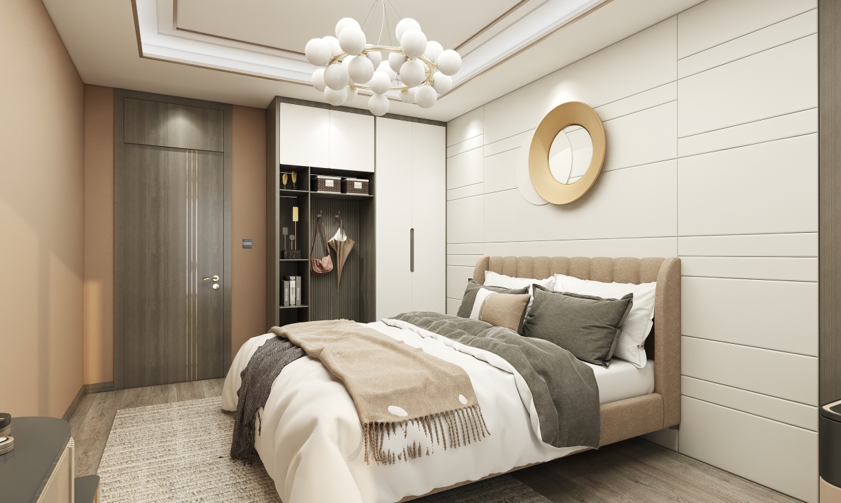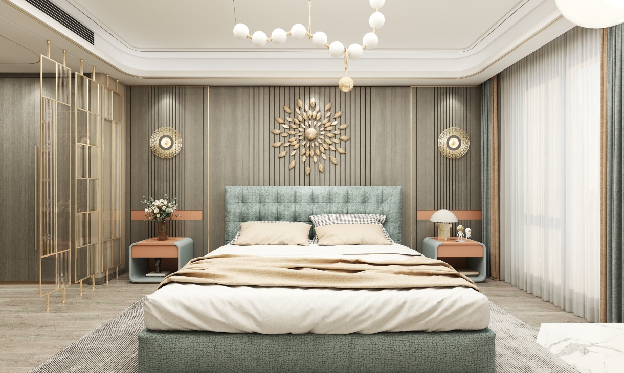 臥室的設(shè)計(jì)風(fēng)格和色調(diào)都是輕奢為主,這兩者都是圍繞這款輕奢風(fēng)格來設(shè)計(jì)的,讓簡單的生活盡顯品質(zhì)。臥室的床頭背景做了木飾面的設(shè)計(jì),把睡眠空間的延續(xù)性發(fā)揮到淋漓盡致。