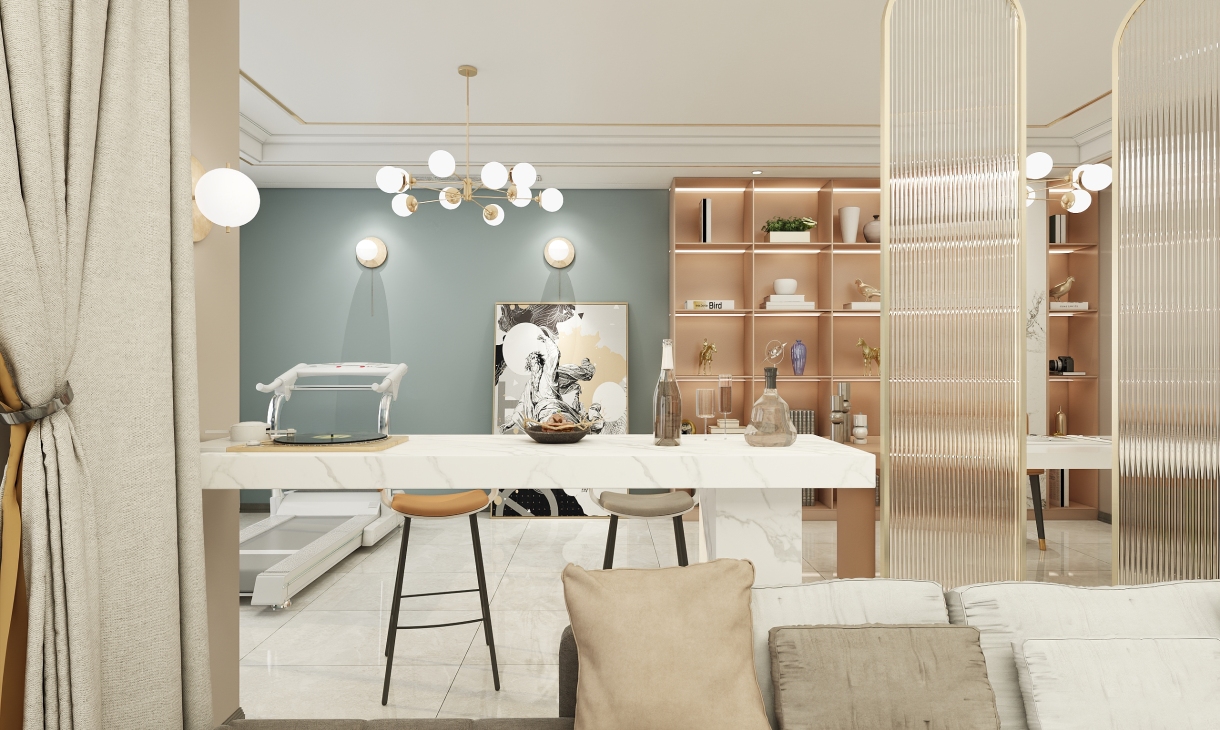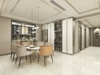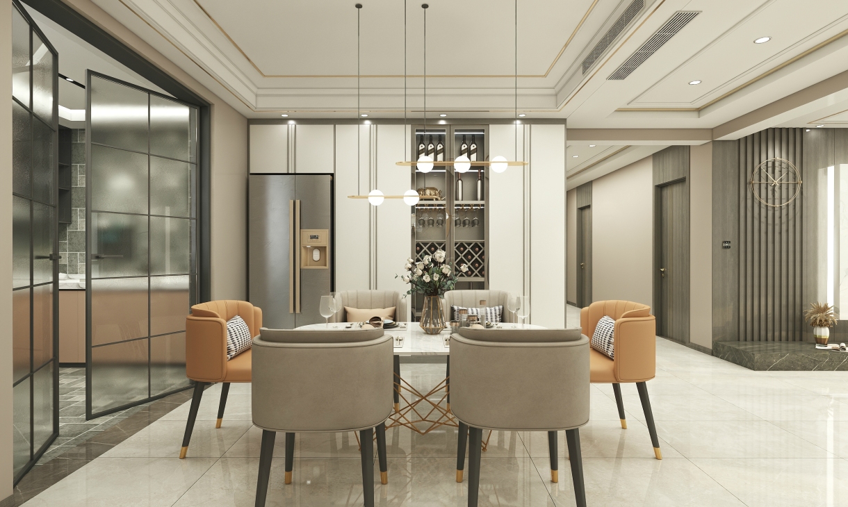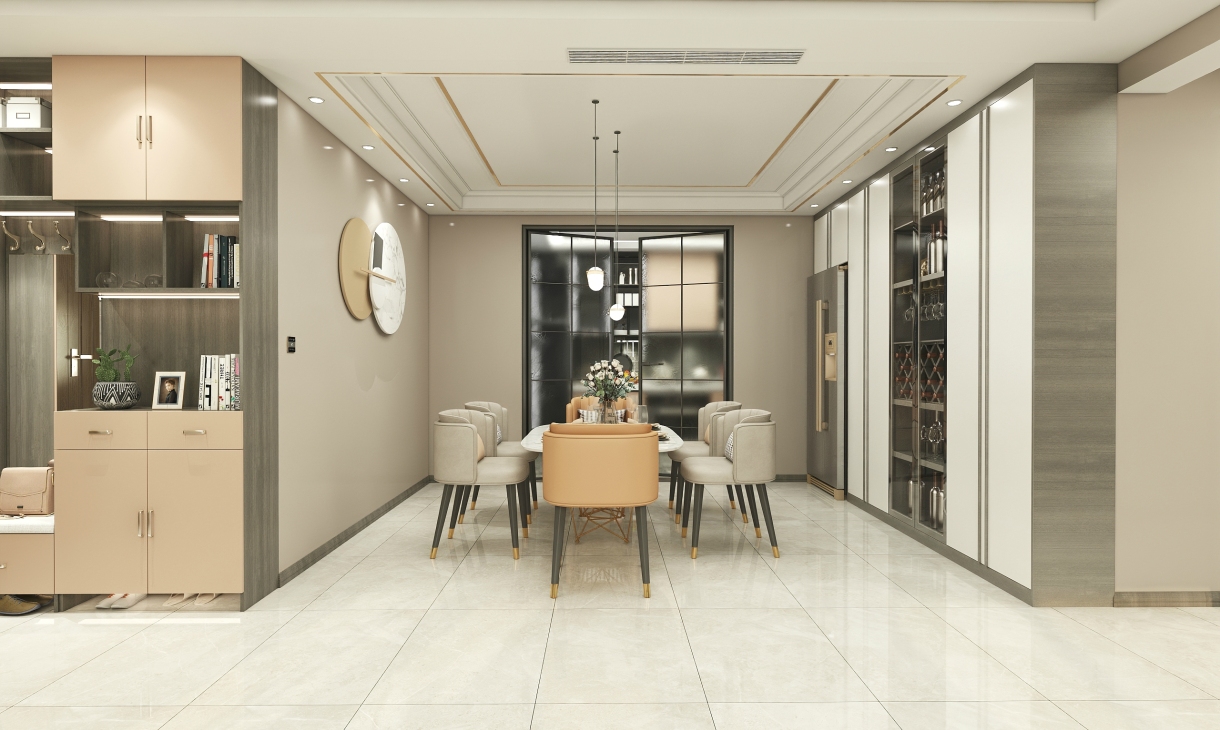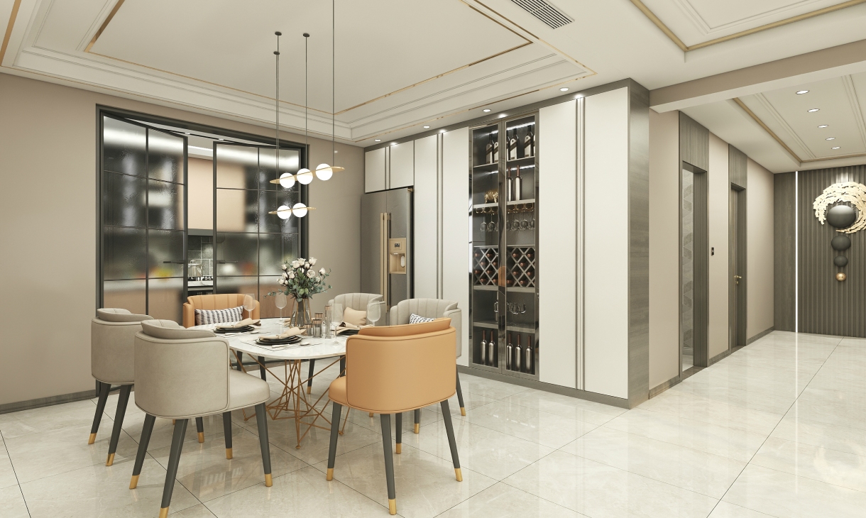 本案以“輕奢舒適生活”為設(shè)計(jì)核心,以時尚靈動的創(chuàng)意表達(dá)出空間的精粹。輕奢餐廳,鑲嵌式冰箱玻璃柜門,主任對紅酒的喜愛,保證了客餐廳的極致整潔。