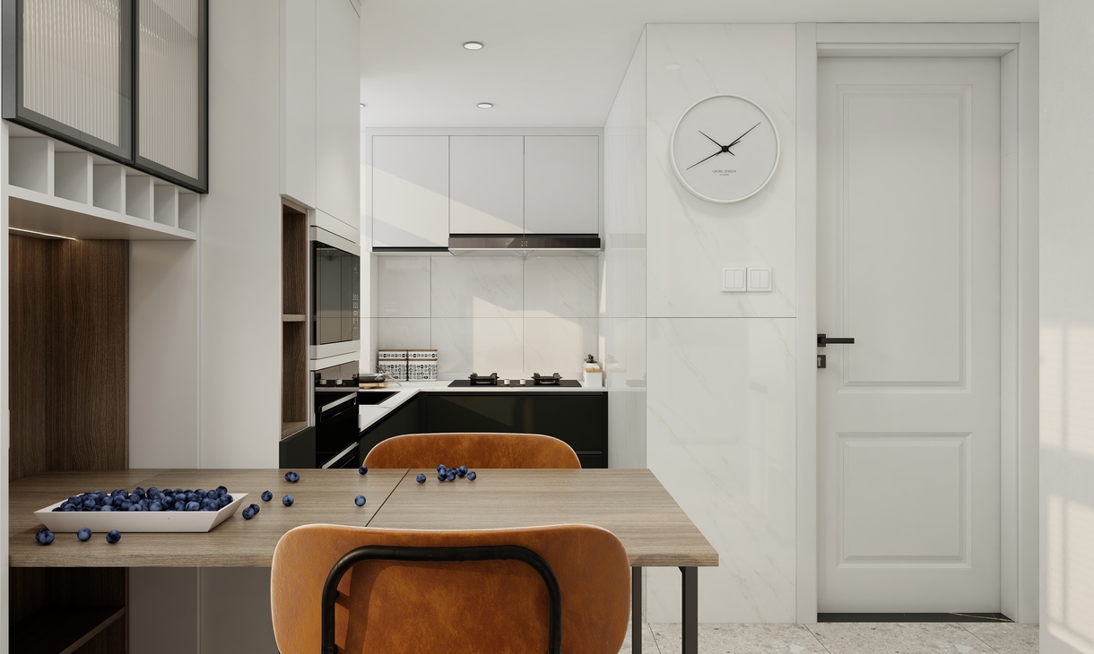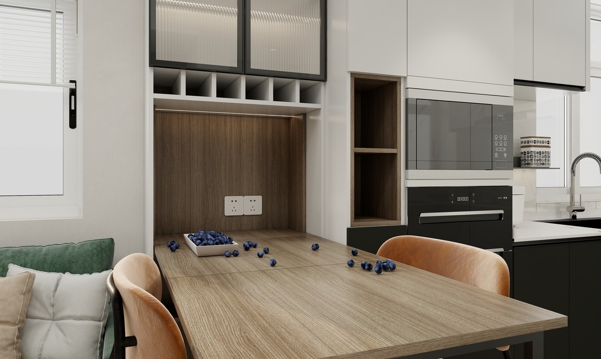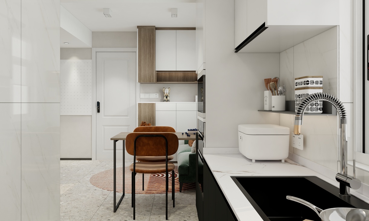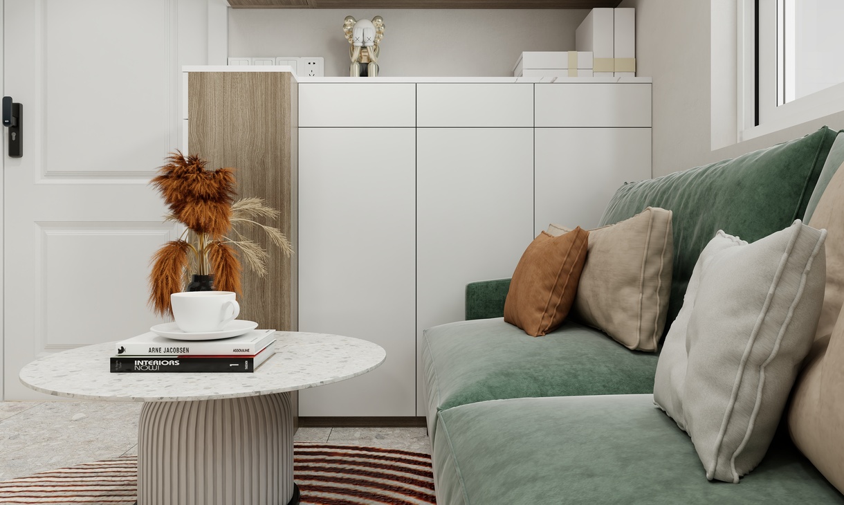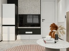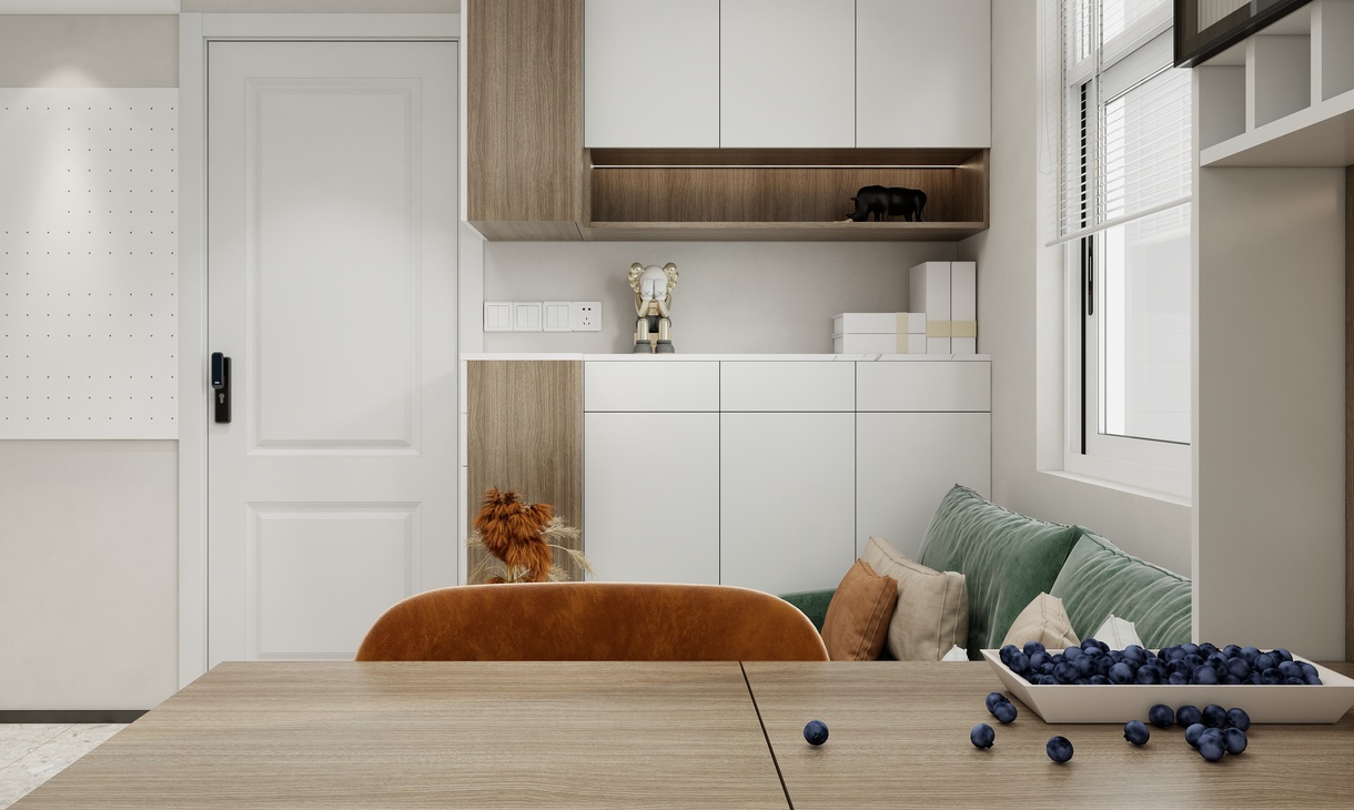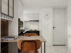 小戶型,現代簡約風。在考慮收納的同時滿足各個空間的功能需求。沙發旁鞋柜吊柜地柜設計,當季鞋類可以放吊柜,換季鞋可以放地柜。方便業主使用。餐桌采用折疊桌設計,在不吃飯時候增加客廳功能區域。拉出來也能當簡易工作臺,或者當廚房操作臺。