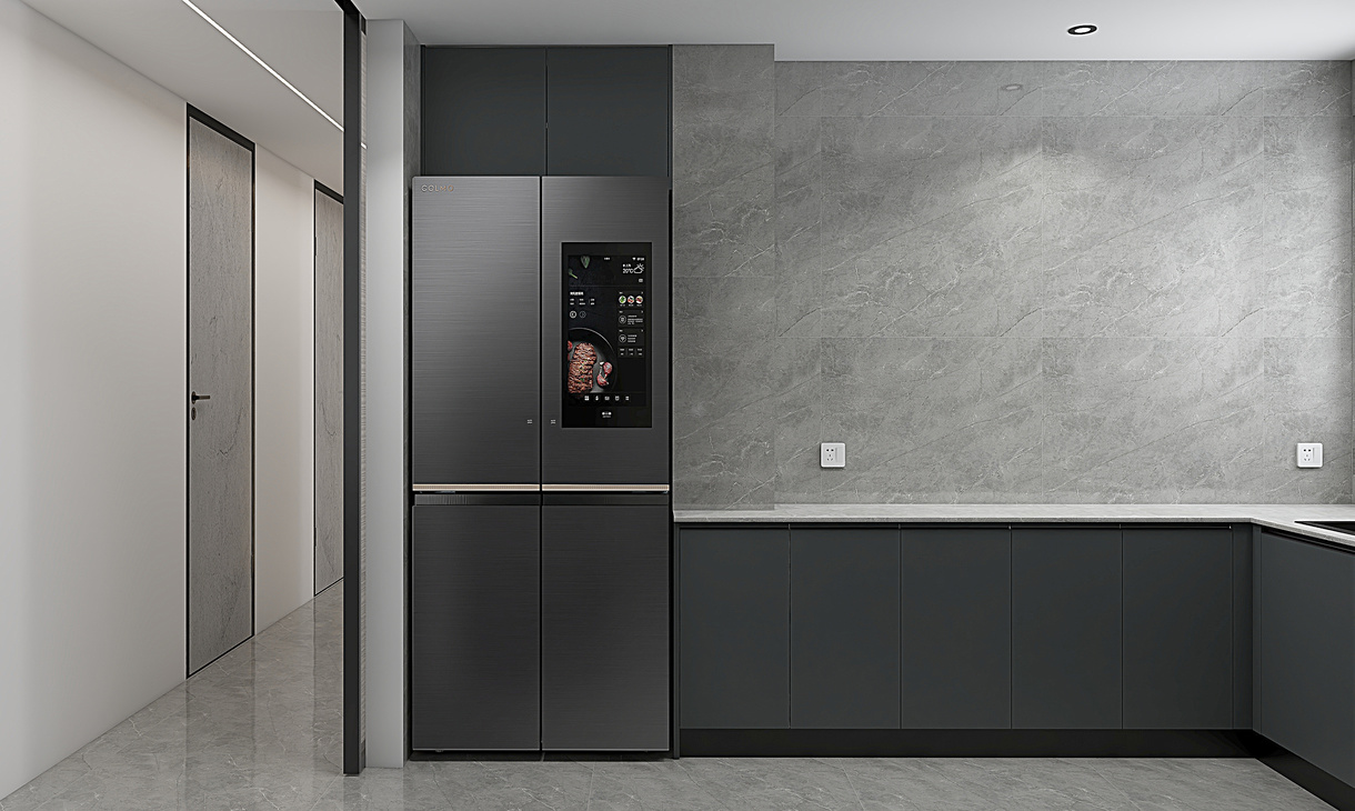 采用定制柜子,臺面選用的大理石紋路巖板 墻、地面選用的800*800啞光大理石磚,廚房的移門是啞光黑極簡邊框的吊軌移門和極窄啞光黑不銹鋼門套。 考慮到天氣炎熱時廚房間太悶熱,還配置了廚房專用空調(diào)。