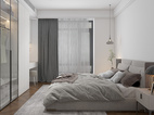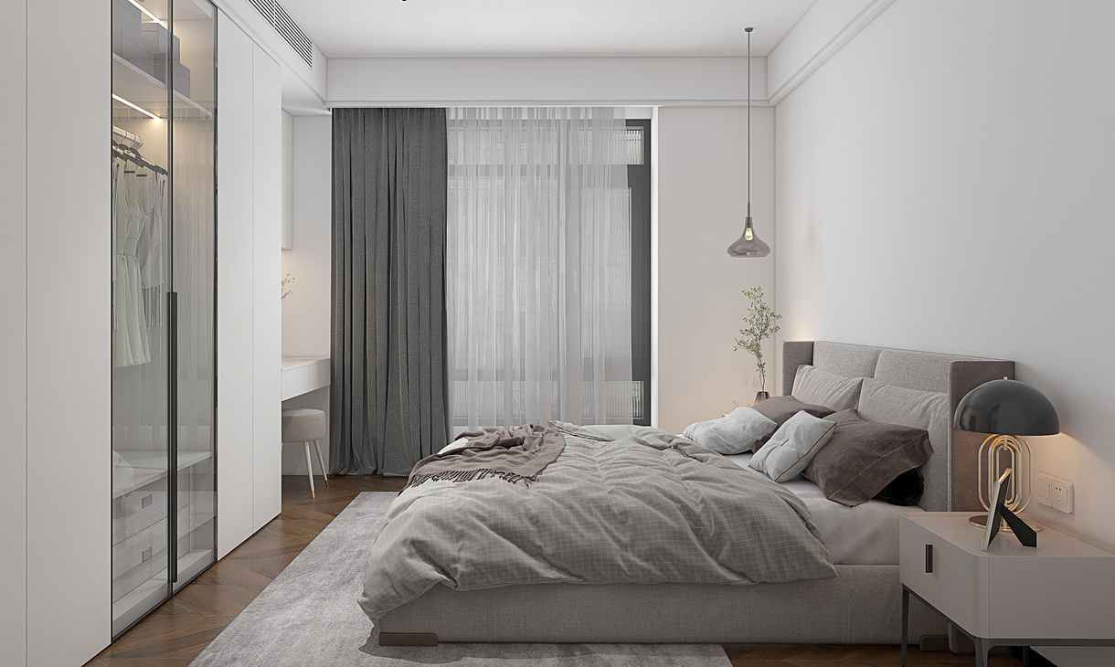 主臥是波折最多的一個空間了,本來床頭計劃是用波浪板,其他墻面搭配淺灰微水泥。但是最后波浪板已經(jīng)裝好了,最后客戶還是溝通墻面用乳白色,衣柜門板改為啞光白色,地板調(diào)整為原木色。