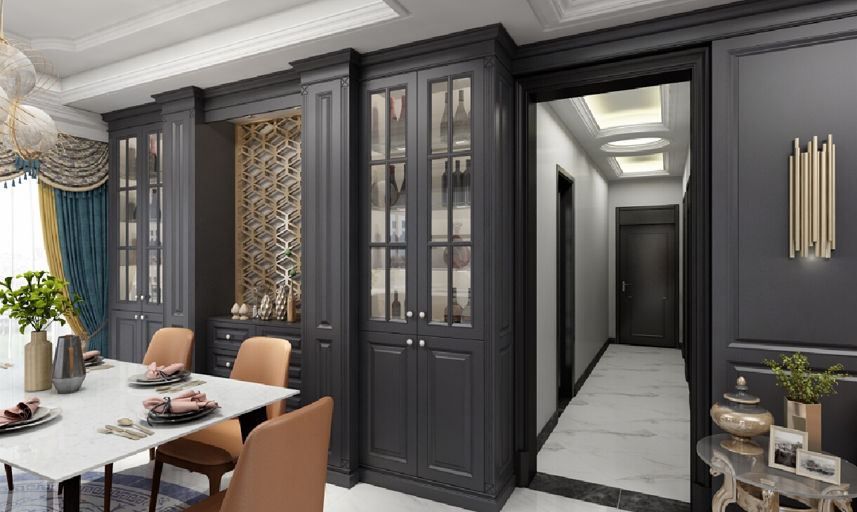 黃銅壁燈、掛畫,一進門就是典型的美式風格。映入眼簾的紳士灰護墻板讓人進入一種深思,但又想進步觀賞。