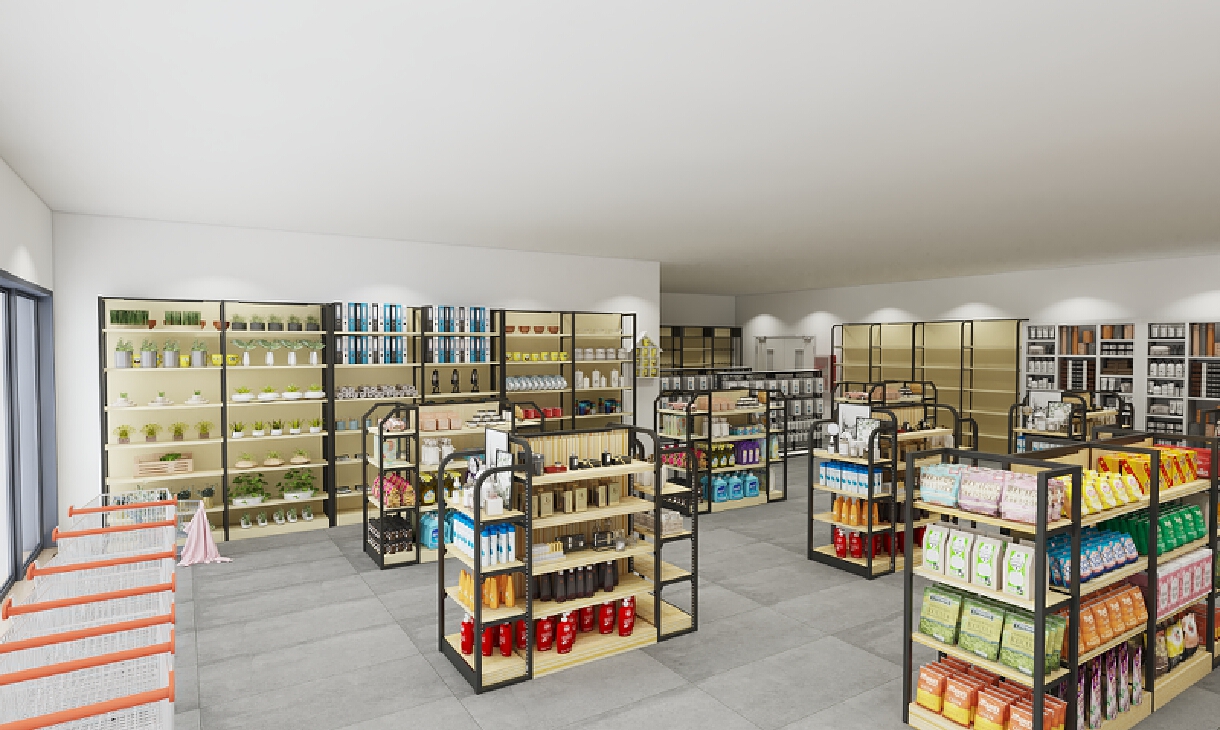 采用新品商超架子,擺放各種商品裝飾展示效果