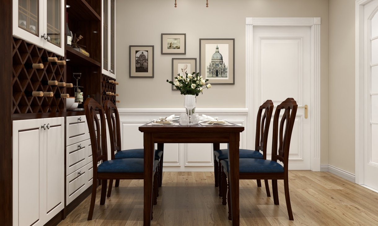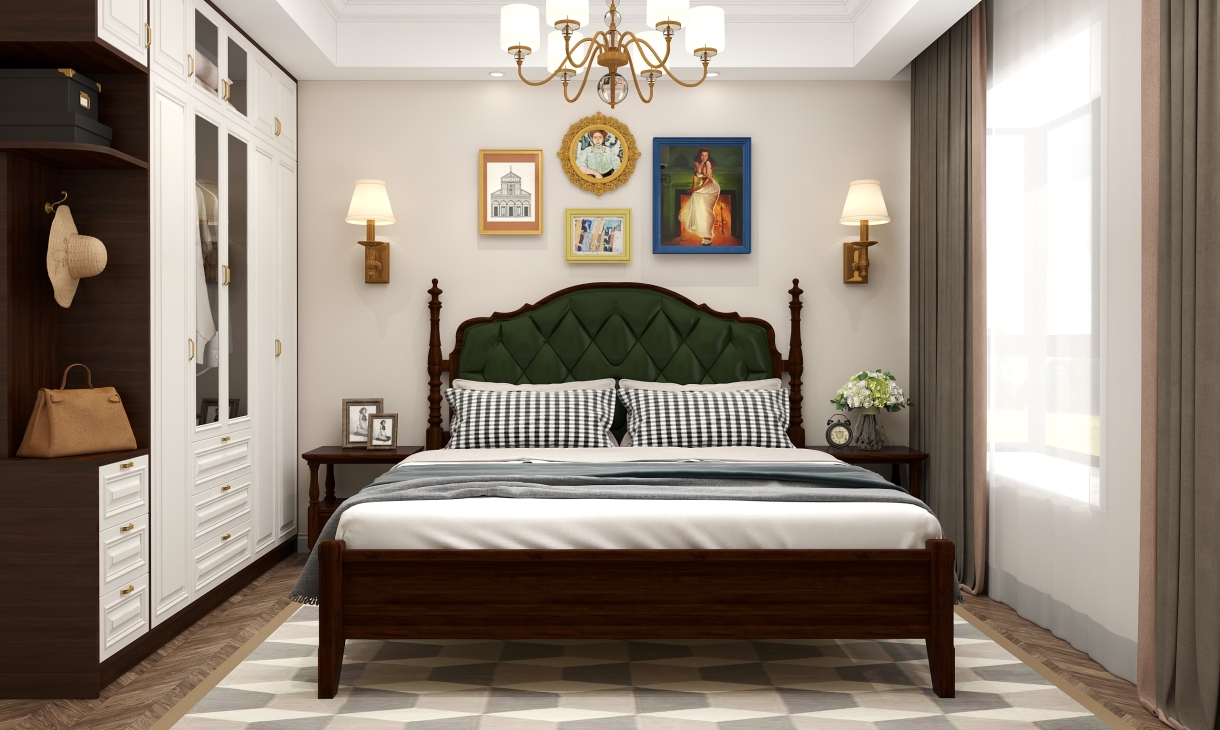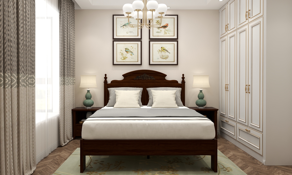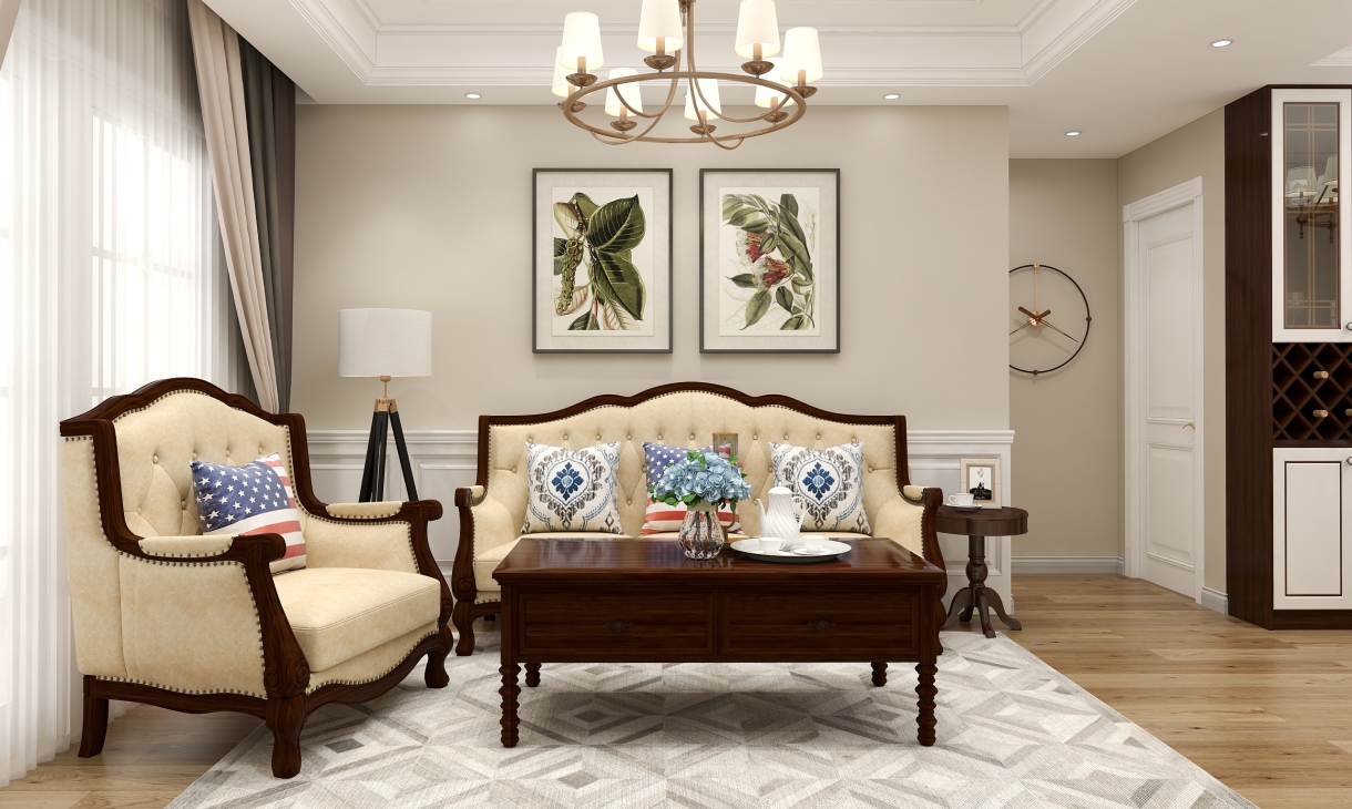 優(yōu)雅的暗棕色簡美家具,將經(jīng)典的精粹延續(xù)現(xiàn)代,高貴深沉而不失自在隨意。軟飾上通過“花鳥葉”的元素和造舊的手法,將美式情懷表達(dá)得淋漓盡致,每個(gè)角落都能感受自然浪漫的田園氣息。