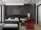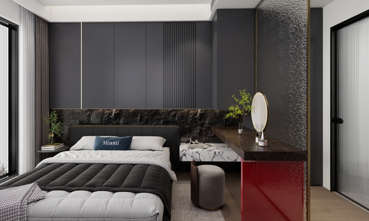 深色為主色調,文化石作為背景,紅色亞克力作為點綴,高級而又典雅