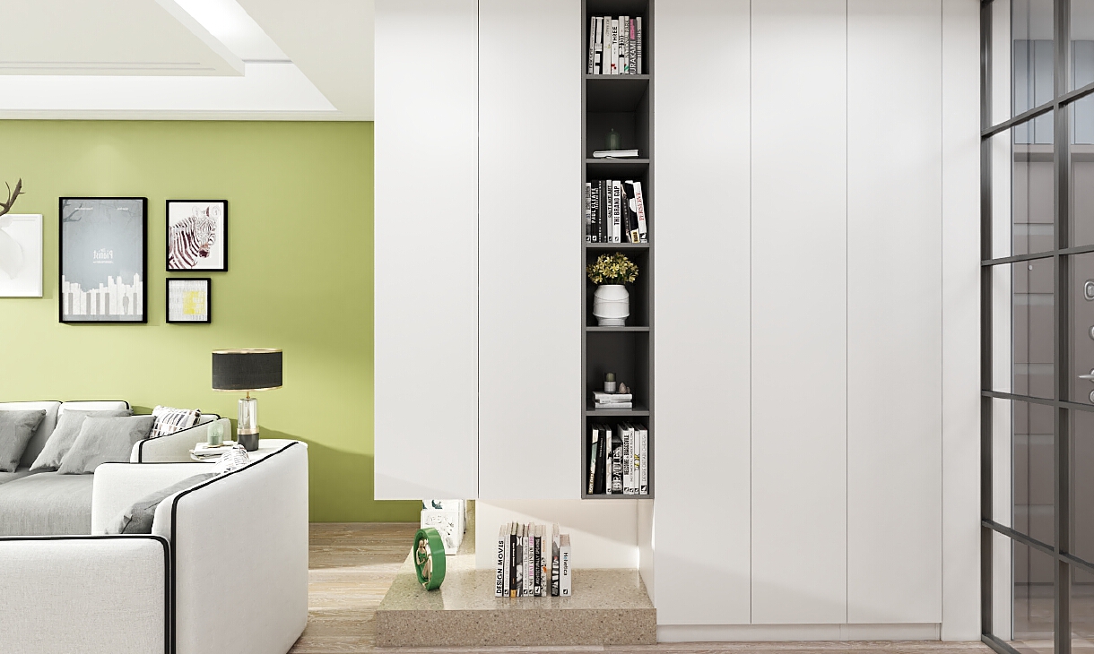 本設計整體空間以現代簡約的風格為主,適用于剛需家庭居住。空間顏色以白色與藍灰色為基調,整個戶型簡潔大方且不失優雅。正對入戶的是一幅抽象創意畫,灰色的基調,跳動的畫面仿佛走入一個寂靜而又生動的世界。客廳活潑的果綠色,使整個空間瞬間充滿盎然與生命之感。