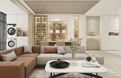 精致小資生活 起居室布局采用橫廳的方式 通過正面落地窗 提高空間采光率 定制柜采用小麥色柜體與白色門板 更是提高了空間的明亮度餐廳不僅作為一個吃飯的區域 也可以用來讀書辦公 陽臺上的收納柜 大大增加了儲物空間 更是可以滿足主人的愛好 可以養一些花花草草