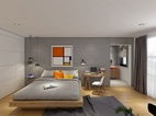 主臥空間整體以灰色為主調,加上蒙德里安的點綴色,讓整體亮起來。而床頭的小車又增加了整個空間的趣味性。