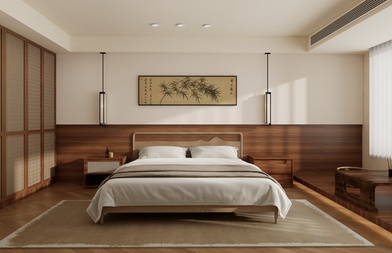 此臥室設計采用中式宋式風格,營造出溫暖舒適的氛圍。墻面以柔和的米白色為主,搭配淡木色床具,營造自然和諧感。夢幻簾讓暖陽灑入,柔和的光線透過輕薄窗簾,增添寧靜氣息。床邊放置簡約的榻榻米,適合冥想與放松,墻面掛有傳統水墨畫,增添文化底蘊。整體布局強調簡潔與舒適,結合綠植與自然元素,傳遞出深厚的禪意,讓人感受到內心的平和與寧靜。