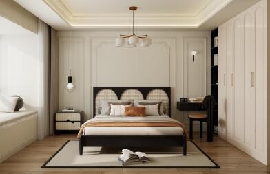 這間臥室以現(xiàn)代簡(jiǎn)約風(fēng)格為主,整體墻面采用溫和的中性色調(diào),與深色木質(zhì)元素相結(jié)合,溫暖的色調(diào)與簡(jiǎn)約的線條相得益彰,營(yíng)造出一個(gè)恬淡且靜謐的空間。