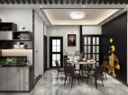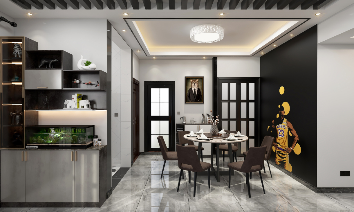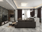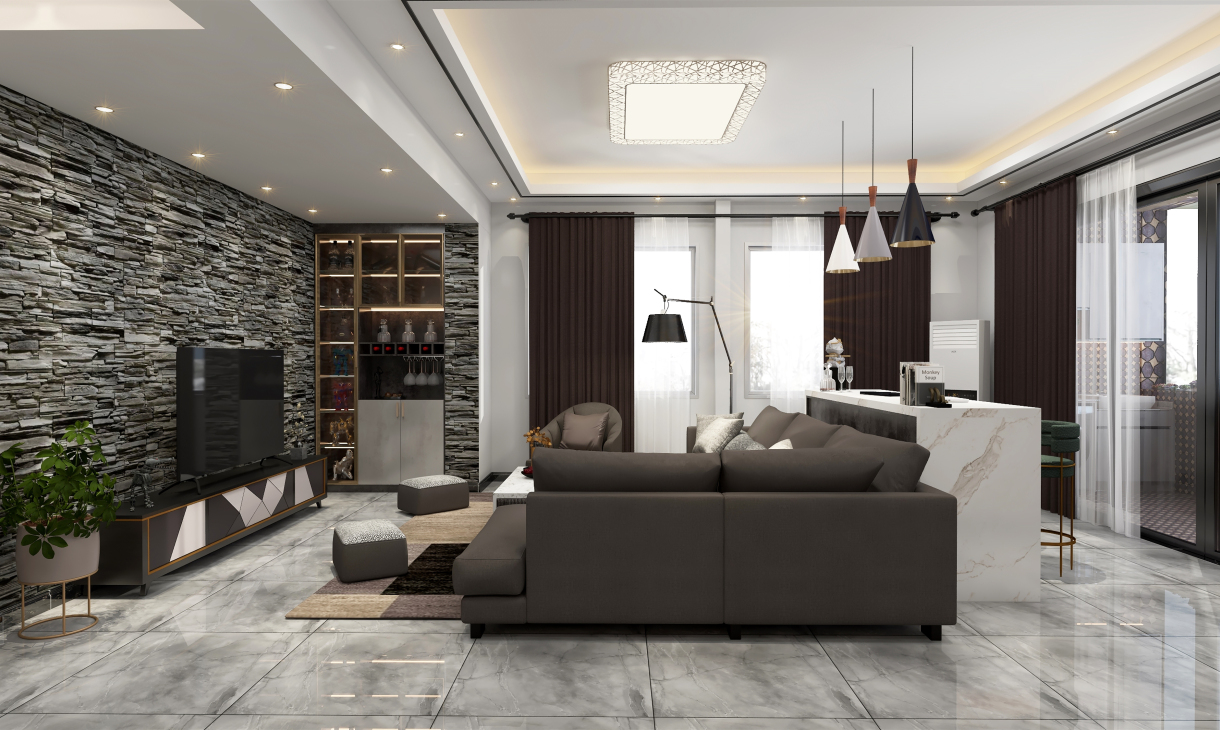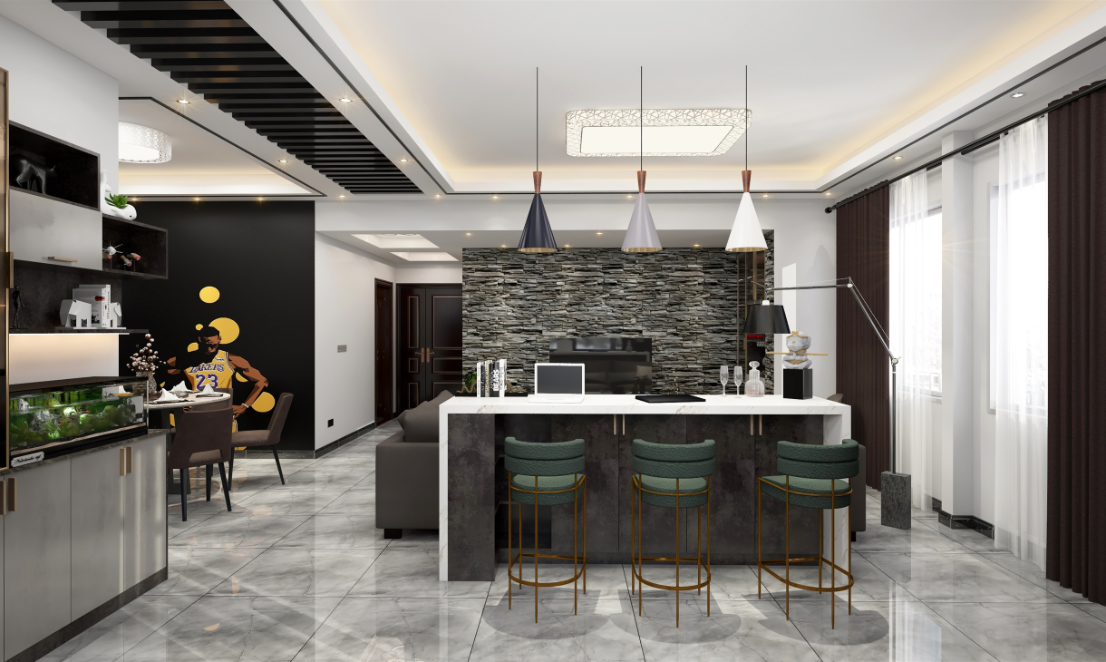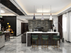 以黑白灰為主調,文化磚的電視背景滲透一點工業風的感覺,搭配深色的沙發和時尚的吧臺,給人整體的高級感。