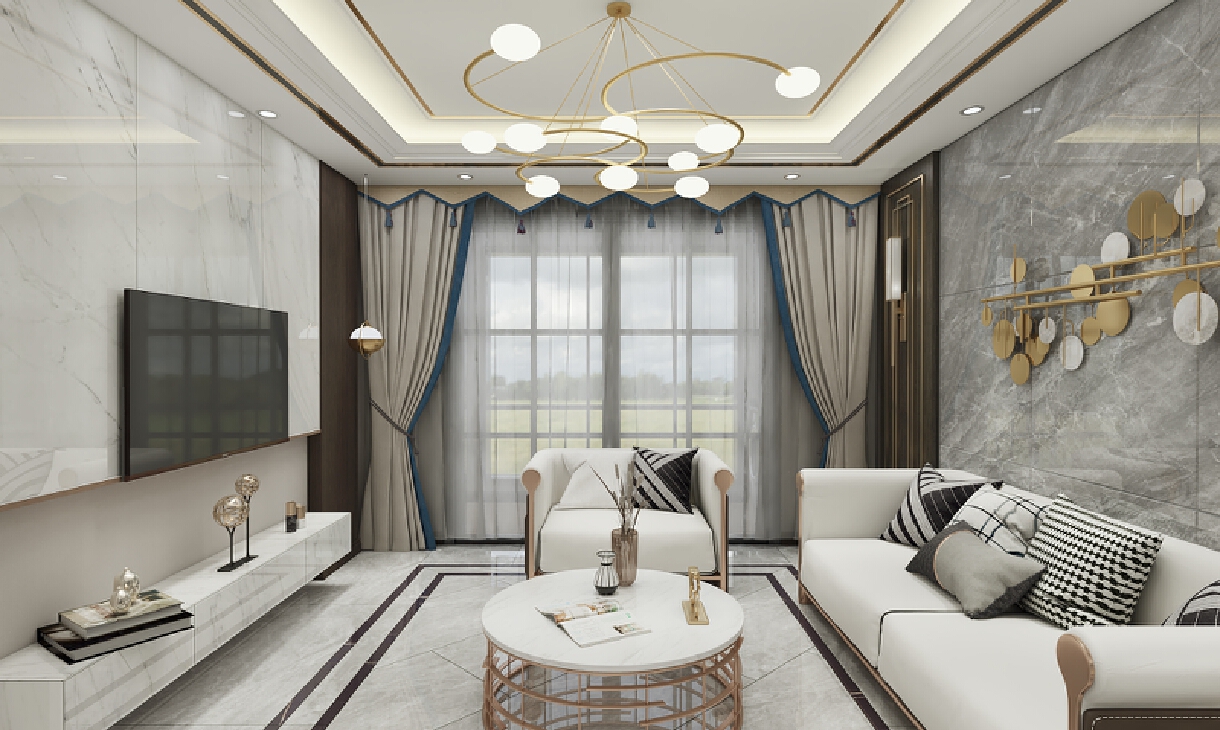 客廳以灰色的地面為底,各種性格鮮明的線條、充斥在空間的細節處。營造出舒適、通透、合理的使用空間,讓整個空間透著一種清澈、靜怡、寧和、雅致之美。