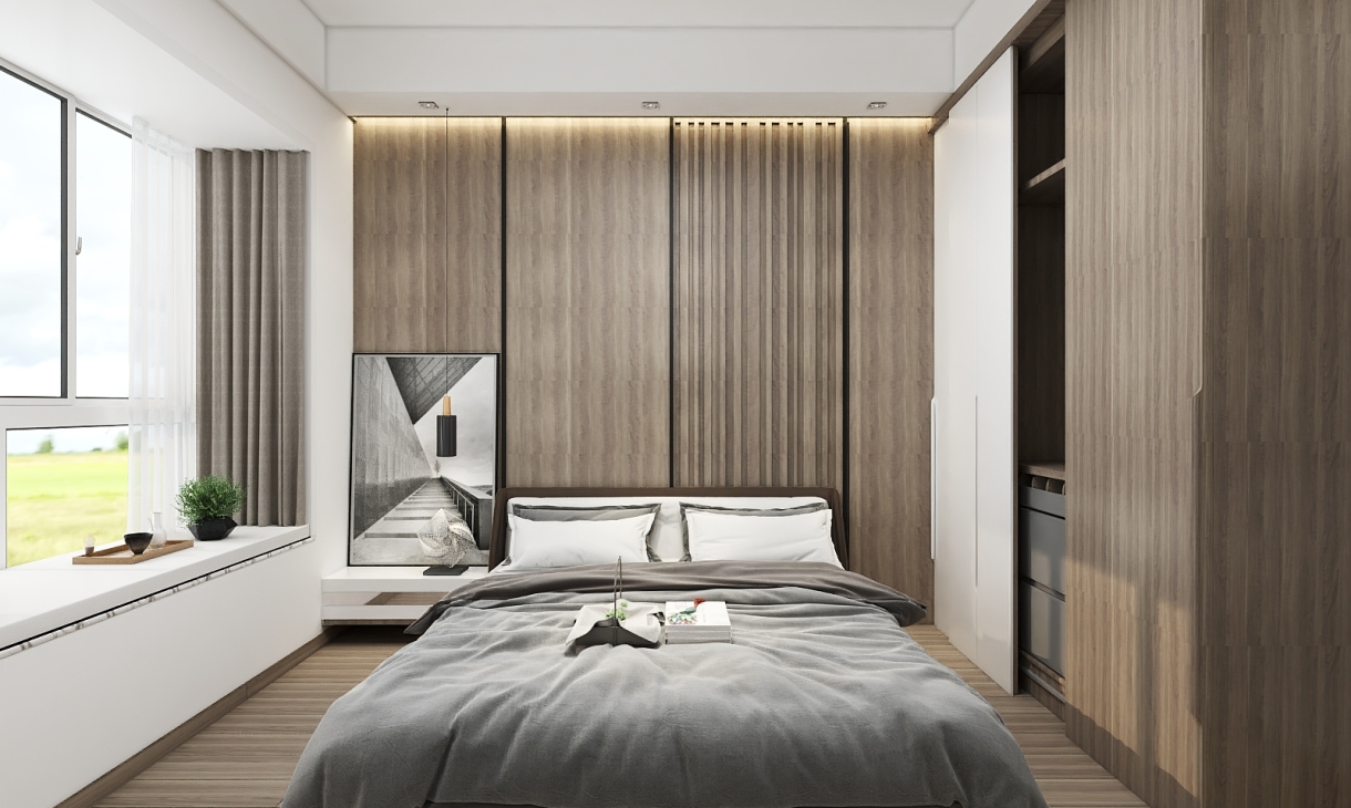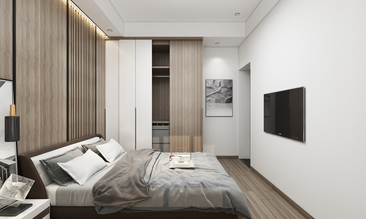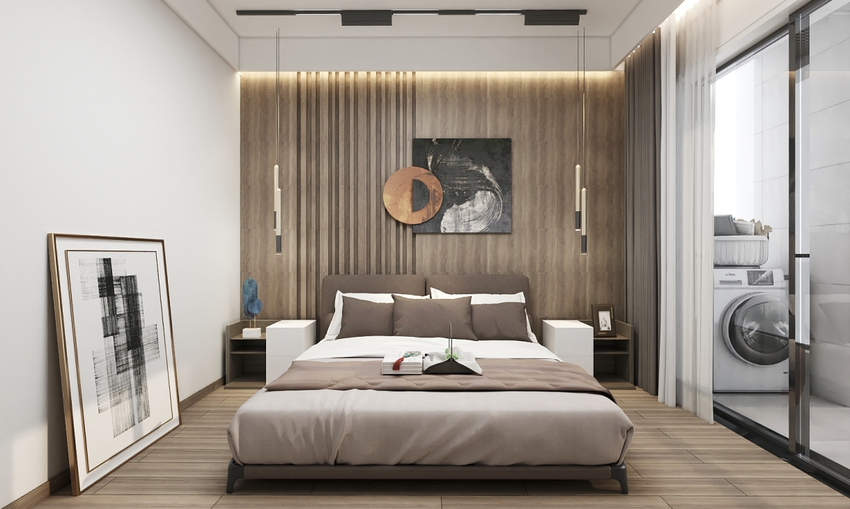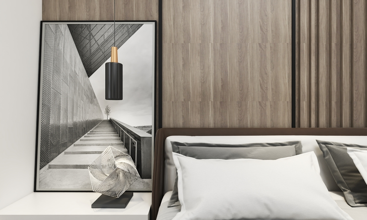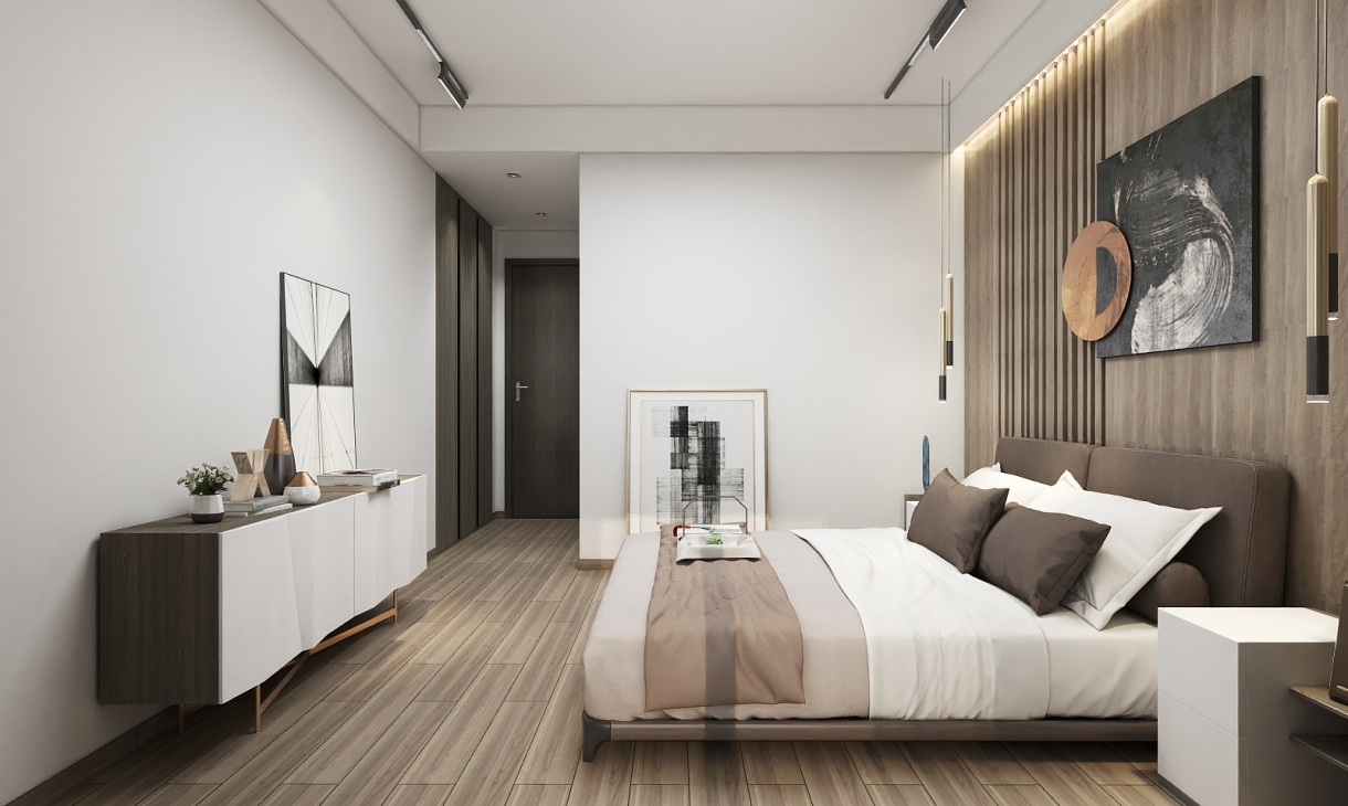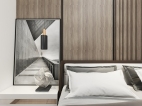 臥室以高飽和色彩為主,映入眼簾的高飽和色彩往往更為提升質感。簡潔留白的格局,是微建筑解構重組的設計手法。