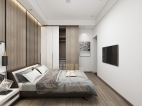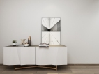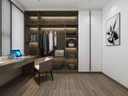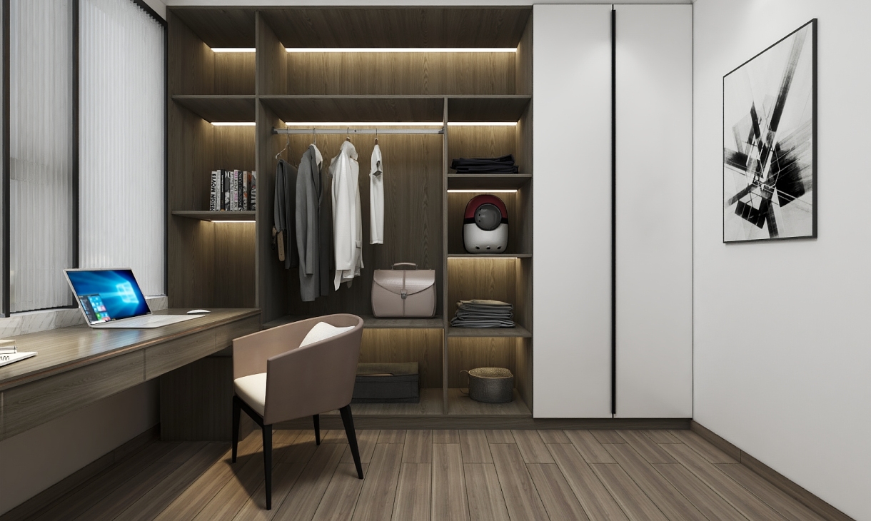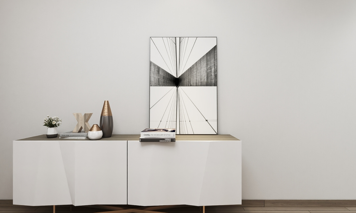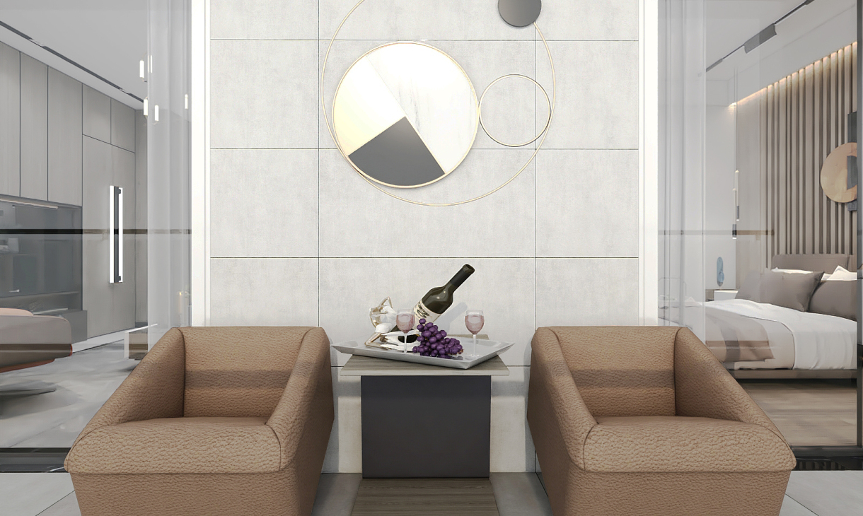 灰色與白色的跳躍空間很好的結合在一起,觸手可及的柔光材質,淋雨背景的金色線條,使整個空間上升一個層次。