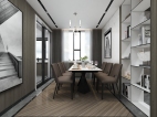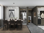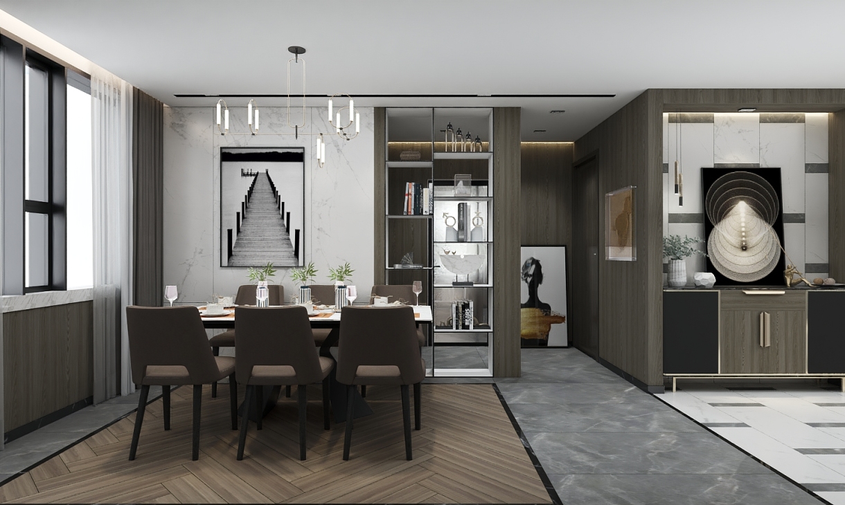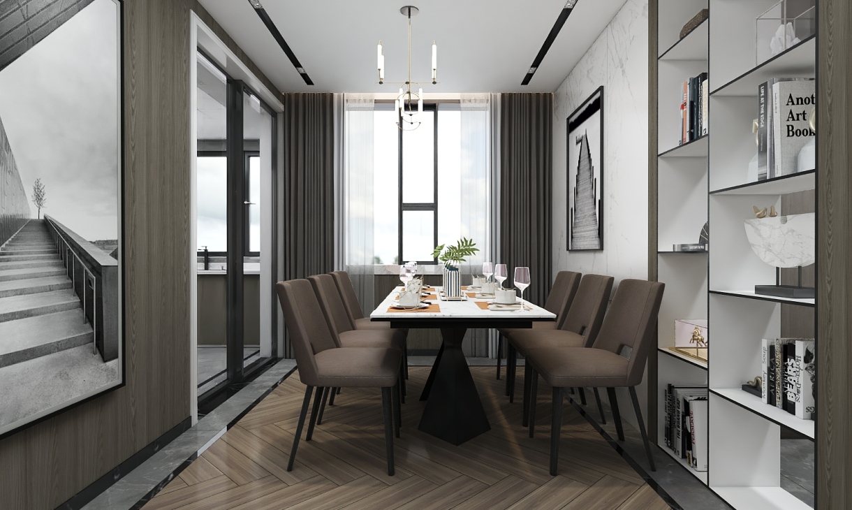通透的客餐廳連貫一起,使得整體布局一覽無余。沙發背景連貫的雅士白墻面與玄關相呼應,增加觀賞性的同時不顯張揚,整體棕色的環境更讓人變得安靜,雅致。
