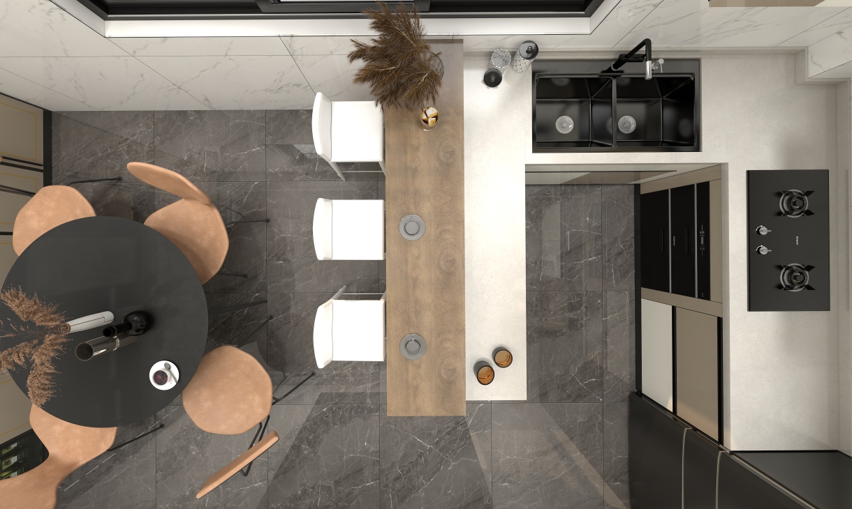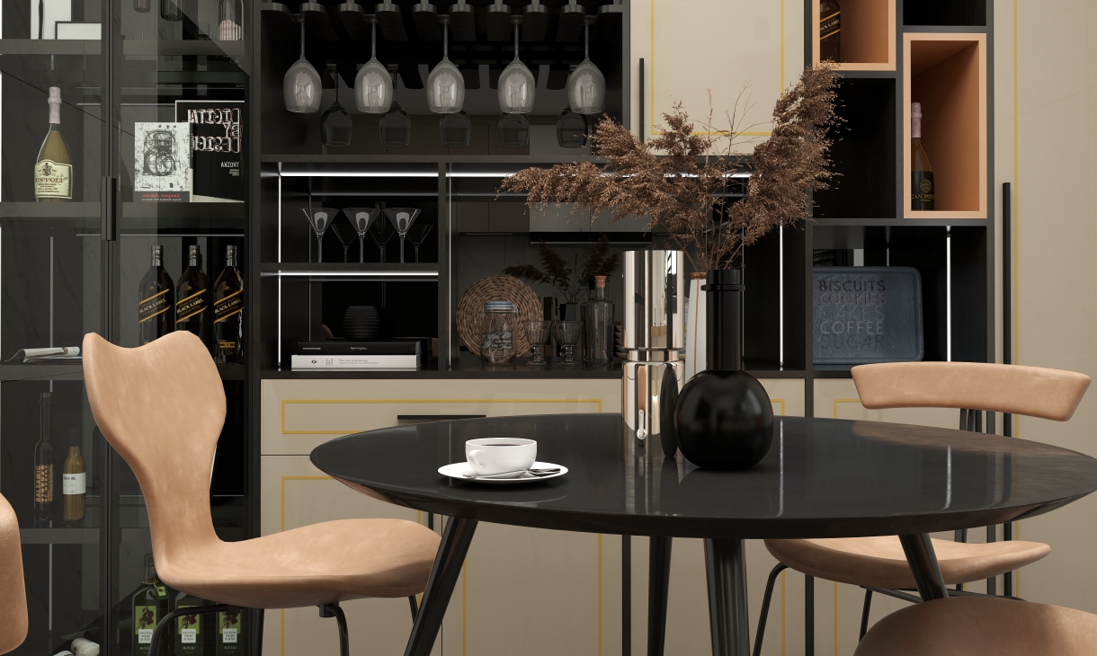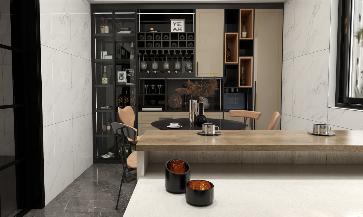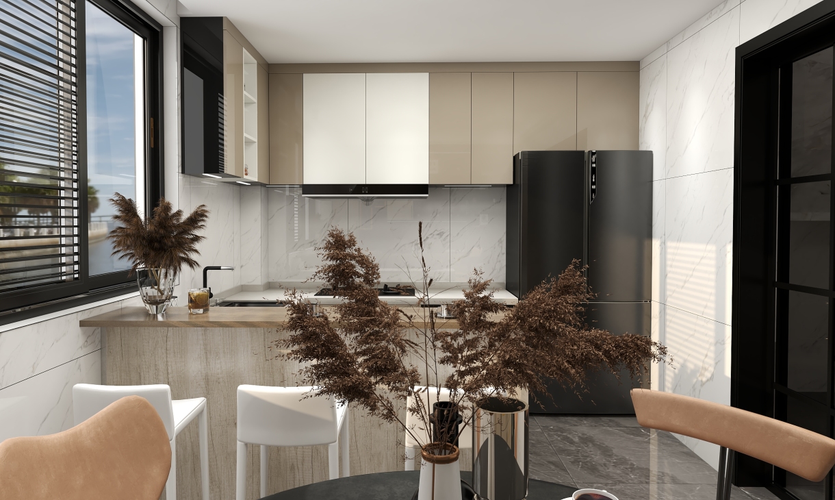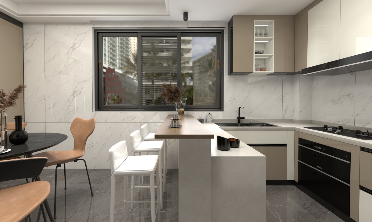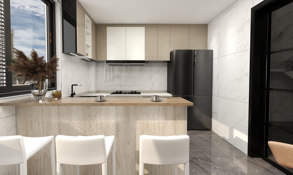 開放式的廚房,以白色,黑色,木色,卡其的經(jīng)典配色,以及白色的布局,現(xiàn)代簡約風格非常講究。