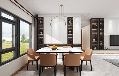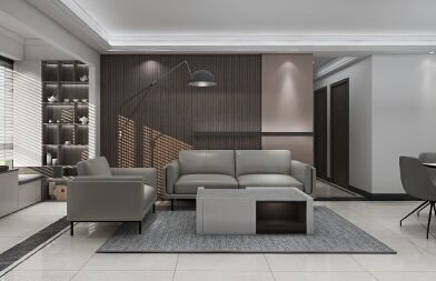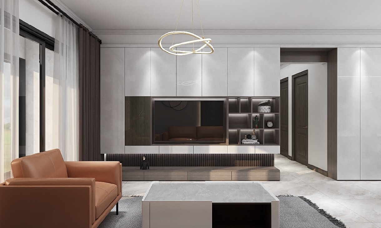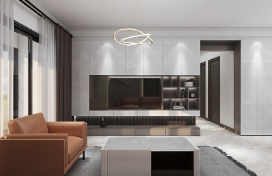 電視背景墻設計了整面電視柜,增加了空間的收納儲物功能,在沙發背景墻部分采用護墻板設計,線條拉伸空間感。