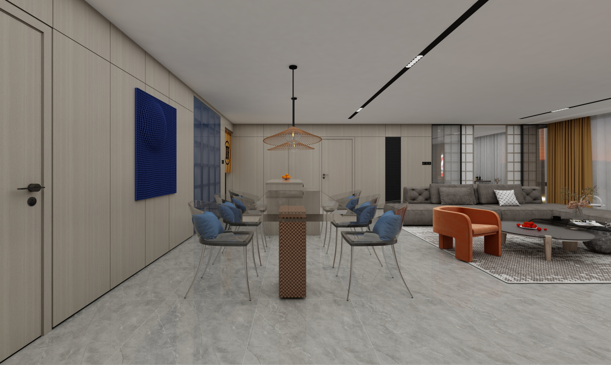 開放式的中島量與餐客廳形成了空間的核心主軸,呼應(yīng)墻面造型,賦予展延空間的可能性