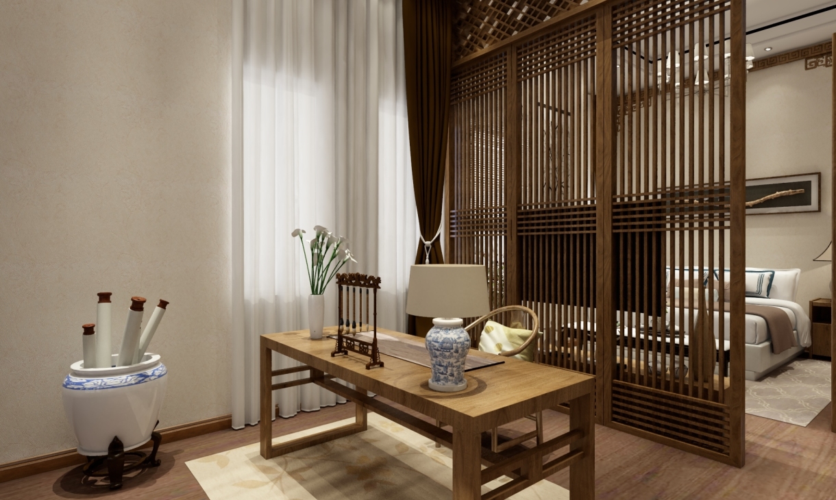 臥室與書房的合二為一,中間用中式的屏風分隔,整體感覺更寬敞,大氣。顯紋的實木家具讓復古懷舊的味道彌漫開來,時間仿佛為空間注入了靈魂,并在此留下了歲月的痕跡,讓人回味無窮。床頭背景的線條設計,靈動的跳躍在墻面,為空間注入些許現代的氣息