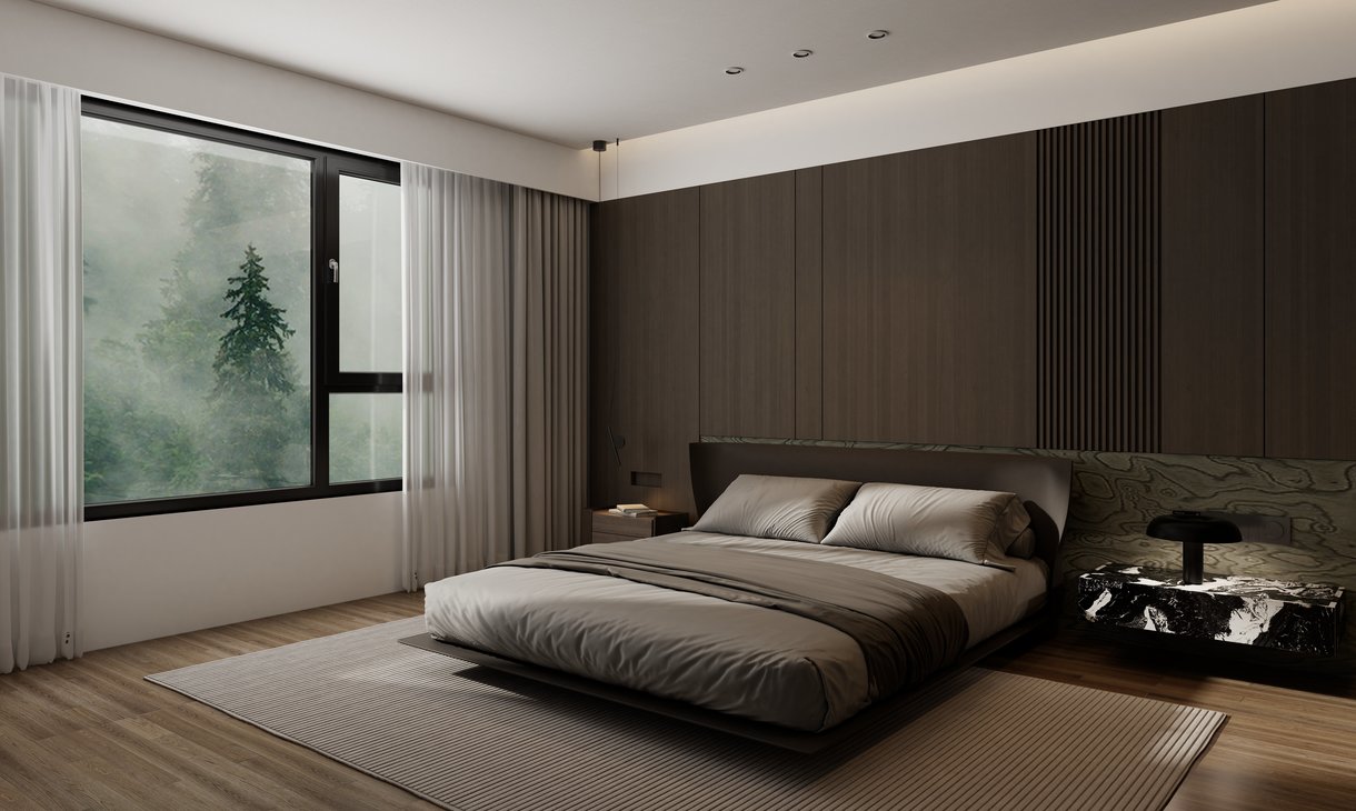 "森凈"設(shè)計(jì)理念旨在打造一個(gè)寧?kù)o、和諧且充滿自然氣息的現(xiàn)代居住空間。通過(guò)大量使用深色木質(zhì)元素,營(yíng)造出沉穩(wěn)而高雅的氛圍,結(jié)合簡(jiǎn)約的家具布置,突出空間的純凈和清新。大面積的落地窗引入室外綠意,使自然景觀成為室內(nèi)的一部分,仿佛置身于森林之中,令人身心愉悅。內(nèi)飾采用低調(diào)而精致的色調(diào)搭配,細(xì)膩的紋理與材質(zhì)呼應(yīng),營(yíng)造出一種靜謐的生活氛圍。整體設(shè)計(jì)強(qiáng)調(diào)人與自然的和諧共生,追求簡(jiǎn)約而不失細(xì)節(jié)的美感,使居住者能夠在紛繁的都市生活中找到一片寧?kù)o之地,享受舒適與放松。