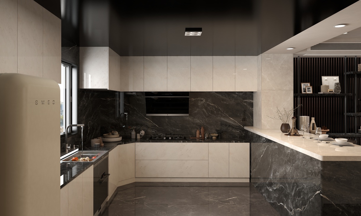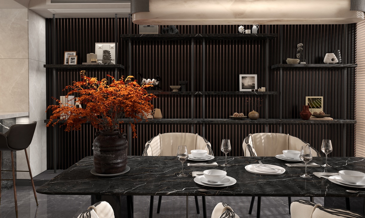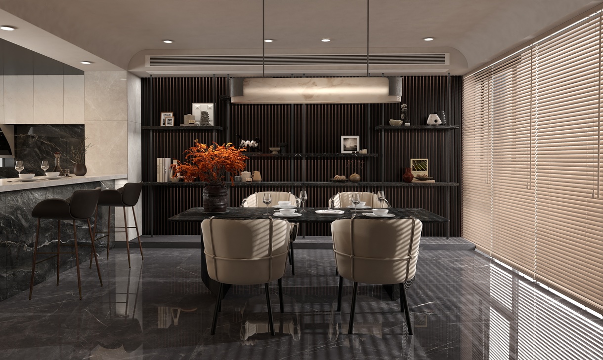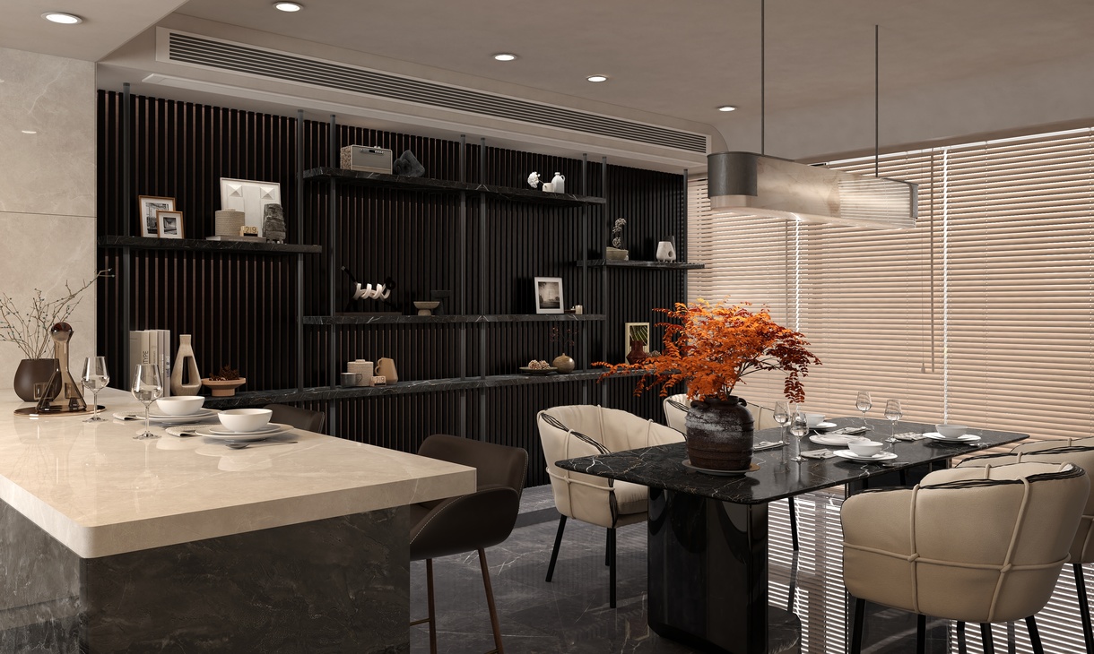這是一個(gè)意式輕奢風(fēng)格的開(kāi)放式餐廚一體空間設(shè)計(jì)方案,可以融合現(xiàn)代與傳統(tǒng)元素,展現(xiàn)出輕奢而不失溫馨的氛圍。以下是這個(gè)設(shè)計(jì)概念的具體描述:在這個(gè)空間里,我們將使用溫暖和高級(jí)的色調(diào)作為主色,如米白色、灰黑色以及柔和的木質(zhì)色彩,這些顏色能夠營(yíng)造出一種高級(jí)寧?kù)o且舒適的環(huán)境。為了突顯奢華感和高級(jí)感,增加了一抹鮮艷的桔紅色,與整個(gè)空間形成對(duì)比,突顯主要區(qū)域的同時(shí)也更加體現(xiàn)方案的輕奢和溫馨感。