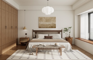 融合中古風格的經典元素與現代簡約設計,以木質家具為核心,打造一個溫馨、自然、充滿懷舊氣息的臥室。