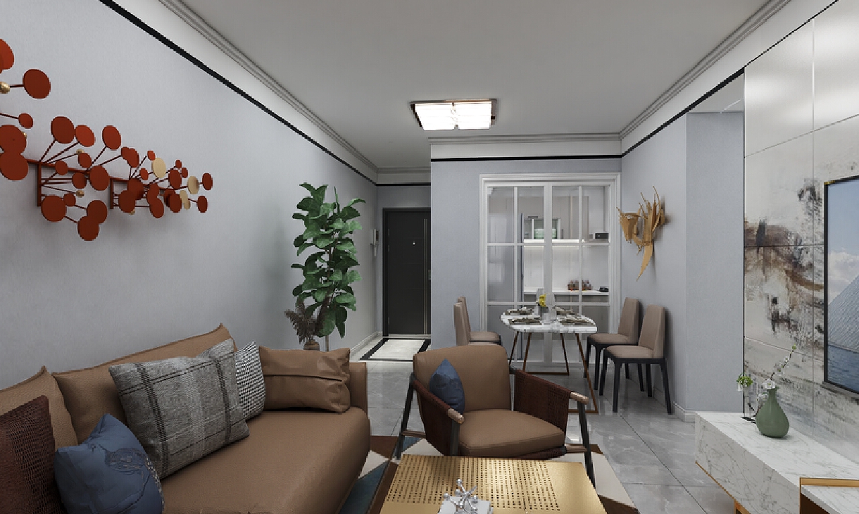 房高比較低,業(yè)主不想做吊頂讓層高顯得更低,也為了節(jié)省預(yù)算,客廳的頂子就用了兩層線條裝飾讓房子有點(diǎn)層次感,頂面沒有做造型,就在兩個(gè)過道處做波打線讓整個(gè)空間的層次更豐富一些!