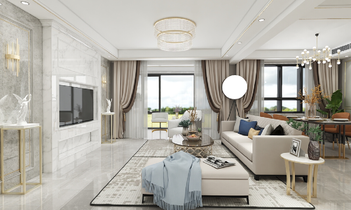 客廳線條優雅的水晶燈,以輕盈的姿態預告了夜晚的浪漫情調。整體空間以暖調白為主,在軟飾上選取愛馬仕橙跳色,清新明快,金色賦予空間優雅輕奢的質感。家私上以皮革、布藝、絨面為主,溫暖舒適。家具選用大理石、木來凸顯質感。