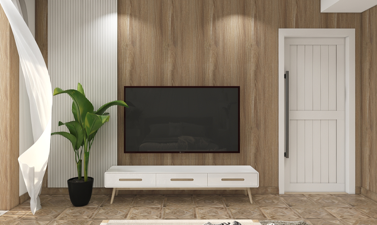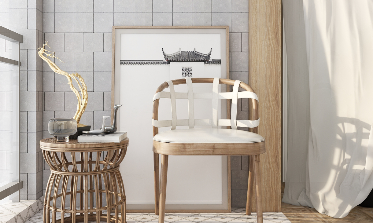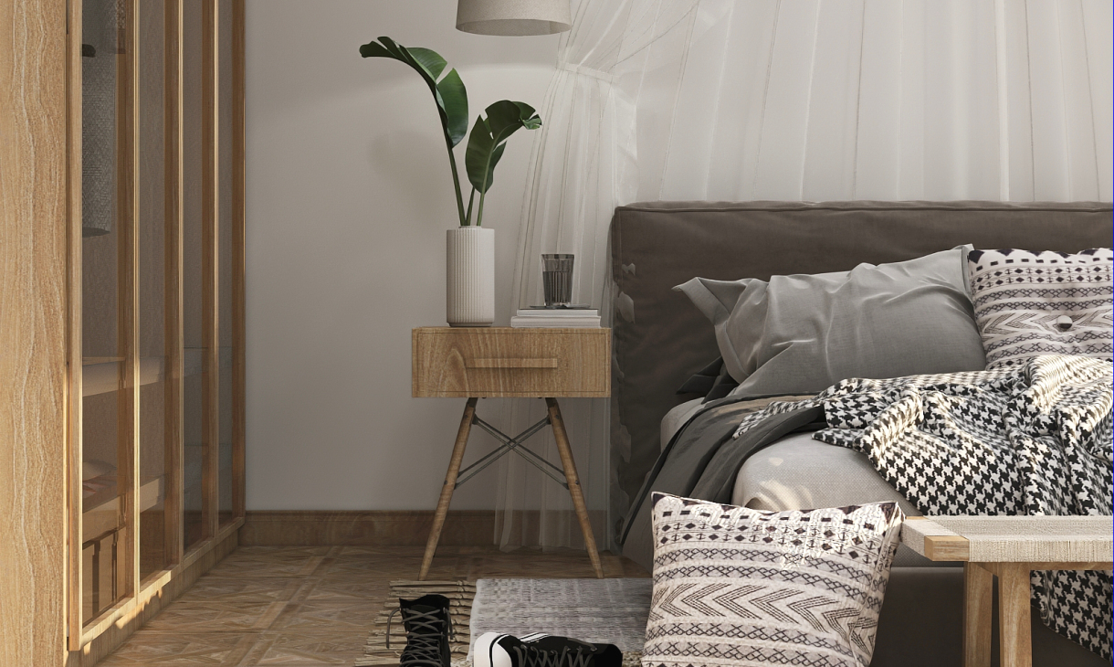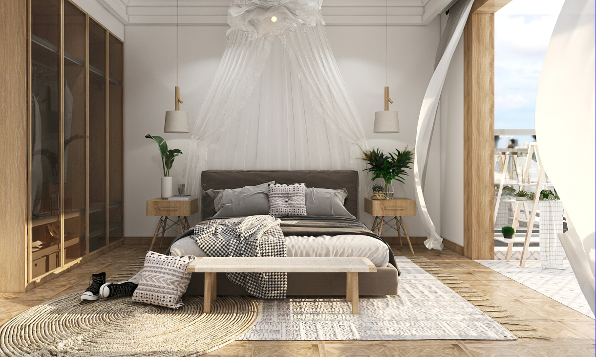 本次方案的業主是一位瑜伽老師,喜歡民族風,整體設計為胡桃木色+白色,偏向于北歐風,地板采用民族風元素,樓前是整片綠地,不用考慮隱私問題。