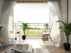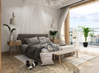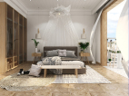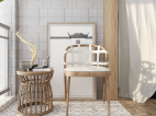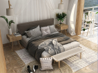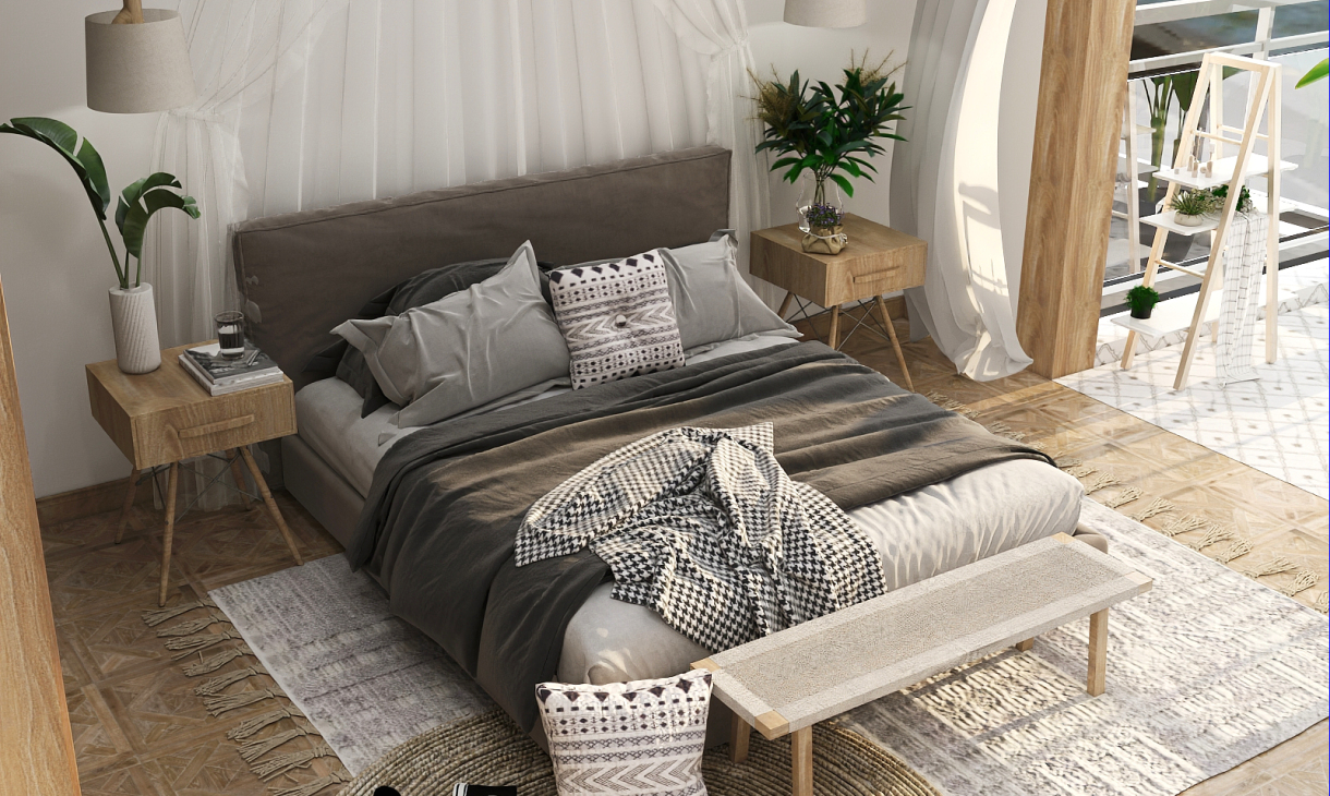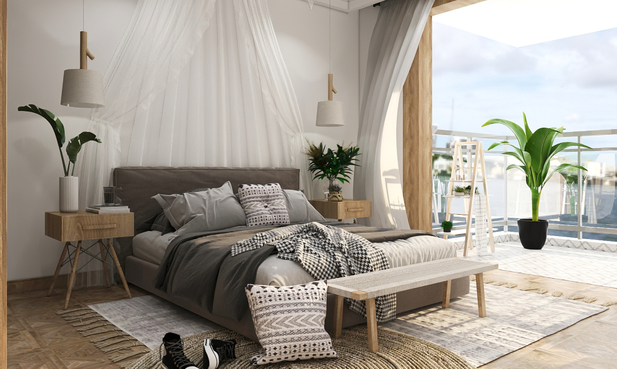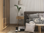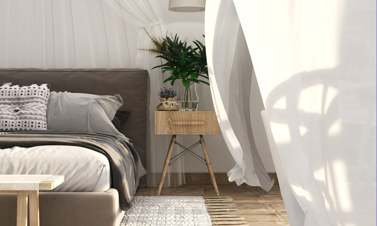 本次方案的業主是一位瑜伽老師,喜歡民族風,整體設計為胡桃木色+白色,偏向于北歐風,地板采用民族風元素,樓前是整片綠地,不用考慮隱私問題。
