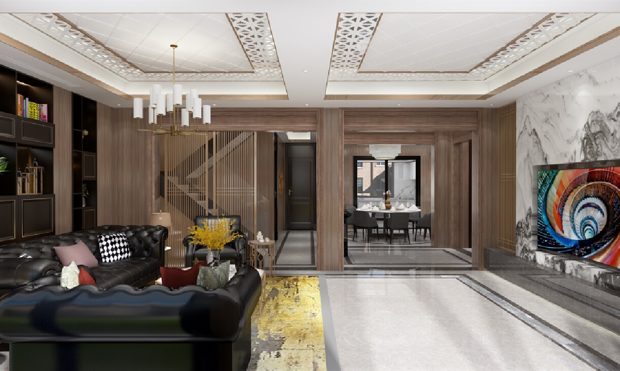 本案為室內商住別墅小區,全屋選用友邦新型材料MGRG材料,暖色金屬線條層次分明,搭配現代棱鏡樣式的單獨模塊。餐廳圓桌配圓頂,整體的顏色和燈光從實用到美觀由頂面詮釋在這個空間。