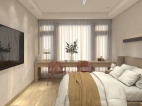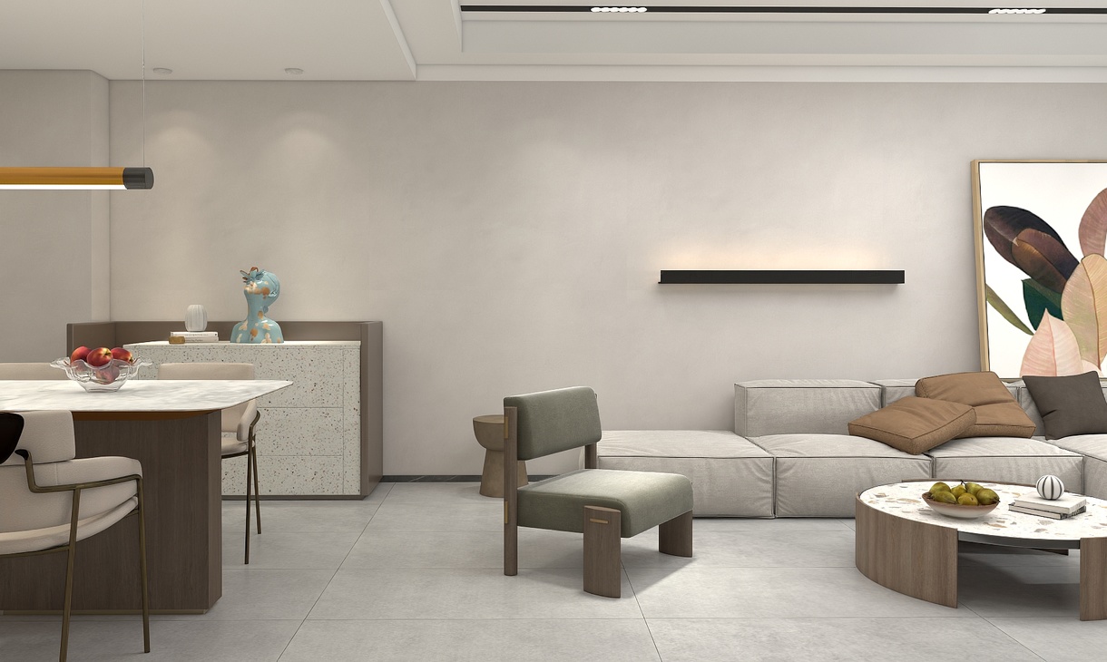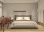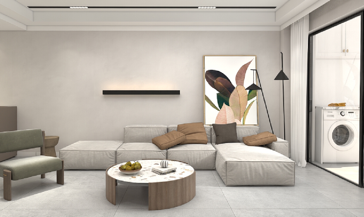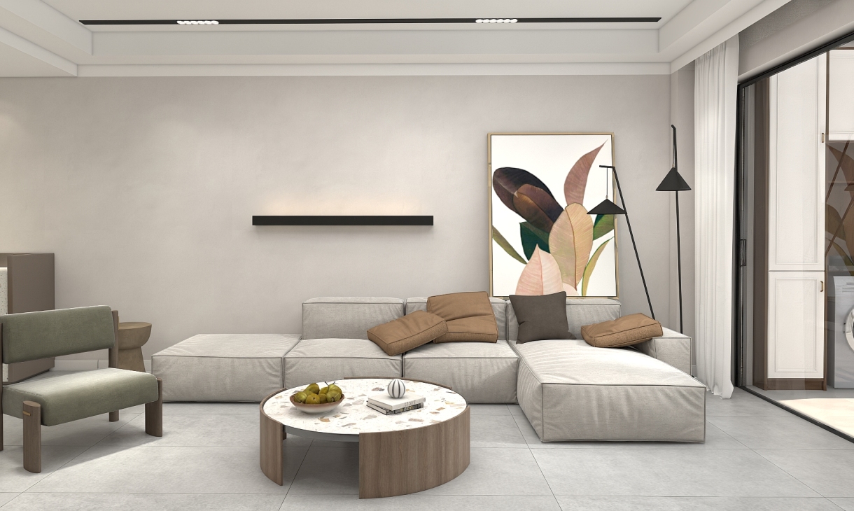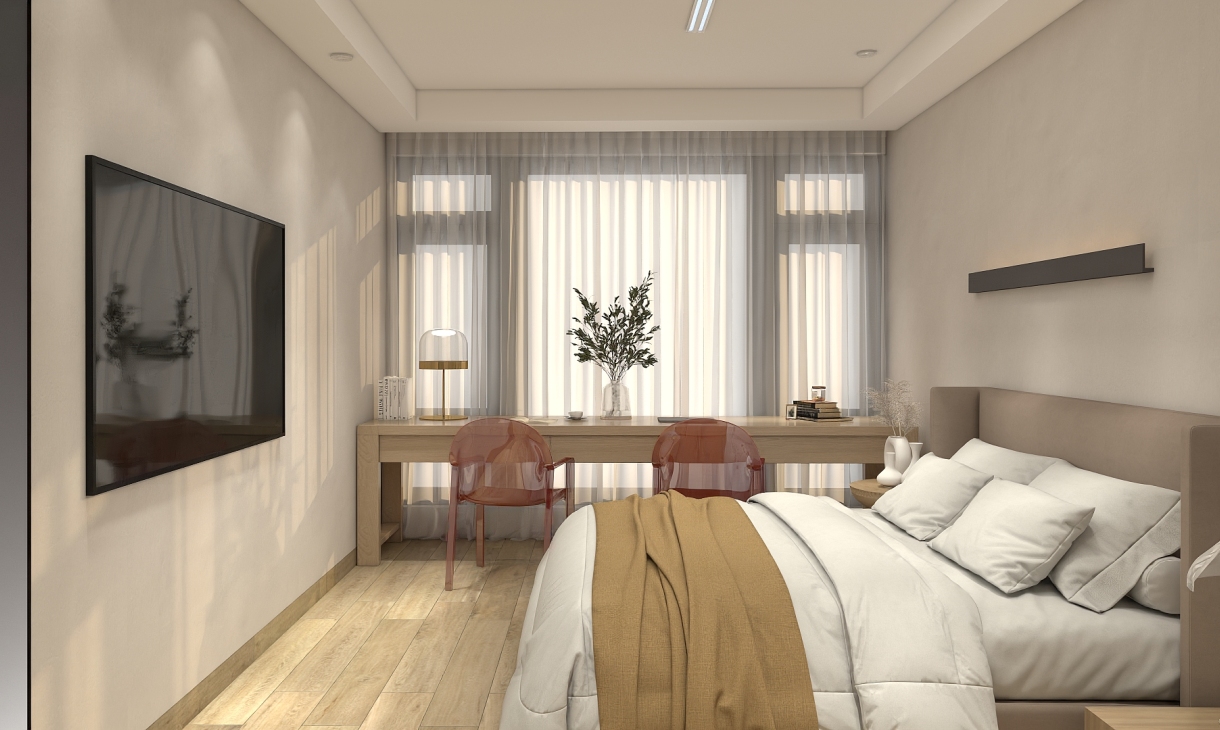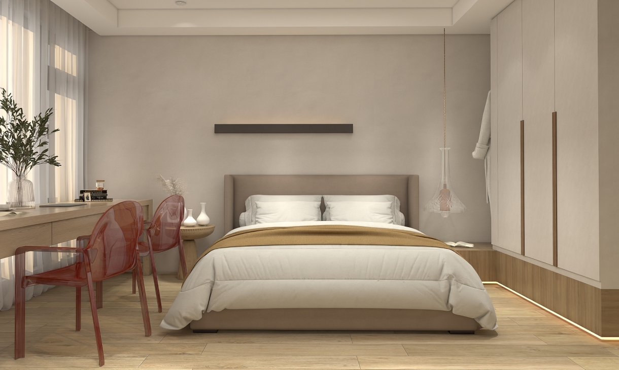 主臥選用了水泥灰加上原木作為主色調(diào),亞克力的休閑椅搭配著原木色的地面,整個(gè)臥室都洋溢著初夏的青春氣息