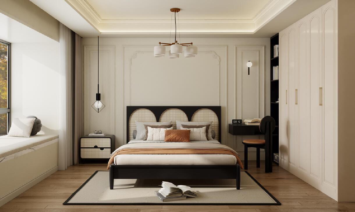 該臥室設(shè)計(jì)采用了輕法式,以奶油白為主色調(diào),搭配上黑色和淺藤編的家具,營(yíng)造出法式復(fù)古的沉穩(wěn)與高雅。橙色點(diǎn)綴不僅打破黑白的單調(diào),同時(shí)為臥室注入了活力與溫暖,讓空間更有層次。