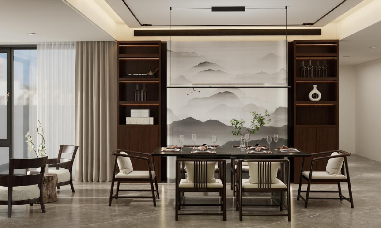 方案將傳統(tǒng)中式與現(xiàn)代審美理念相結(jié)合。空間靈感來(lái)源于山水畫,注重材質(zhì)的質(zhì)感和紋理,以胡桃木實(shí)木材質(zhì)為主,整體營(yíng)造出既古樸典雅又不失現(xiàn)代感氛圍。