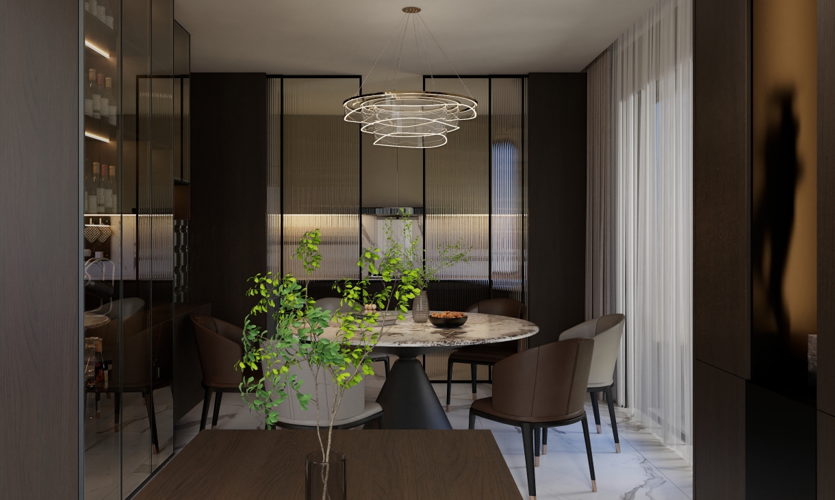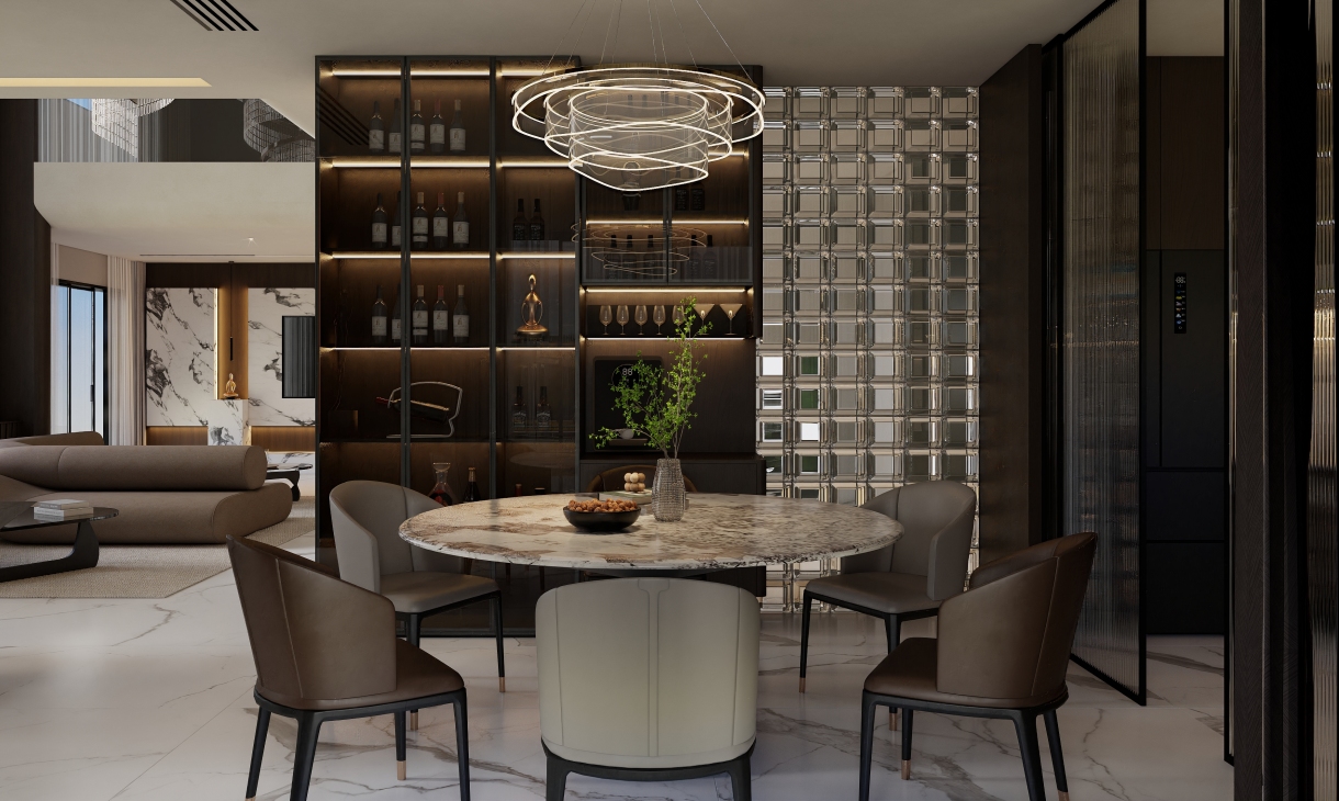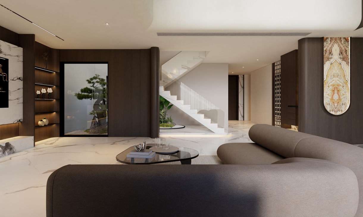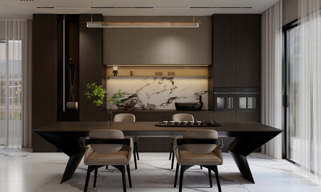 以“少即是多”為哲學,用干凈線條、自然材質(zhì)(與中性色調(diào),構建克制冷感的空間。打光以一盞主光源穿透整個空間,且讓窗口不過曝,加上“青光源光板”還原自然寫實光源。原片直出,效率談單。
