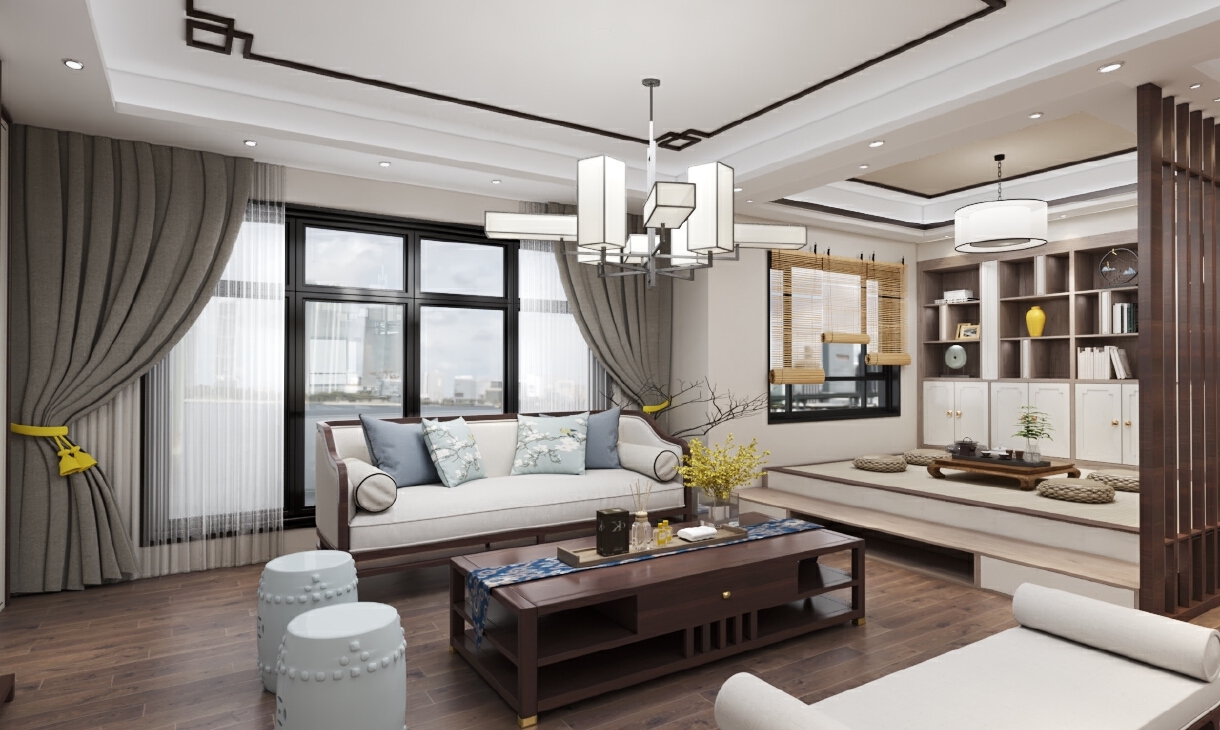 新中式設計,中國傳統元素與現代顏色碰撞,營造格調高雅,簡約大氣的居住空間。 配色采用實木本色,大地色系搭配氣質藍,深邃如天空,博愛如大海,沉穩雅致;搭配中國黃,至尊的顏色,權勢、地位的象征。兩種顏色的的碰撞使空間沉穩大氣又不失靈動