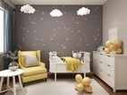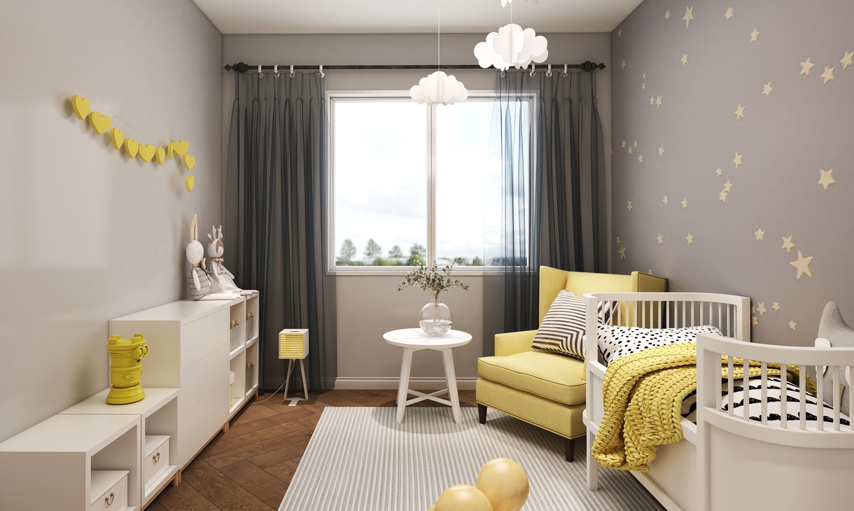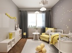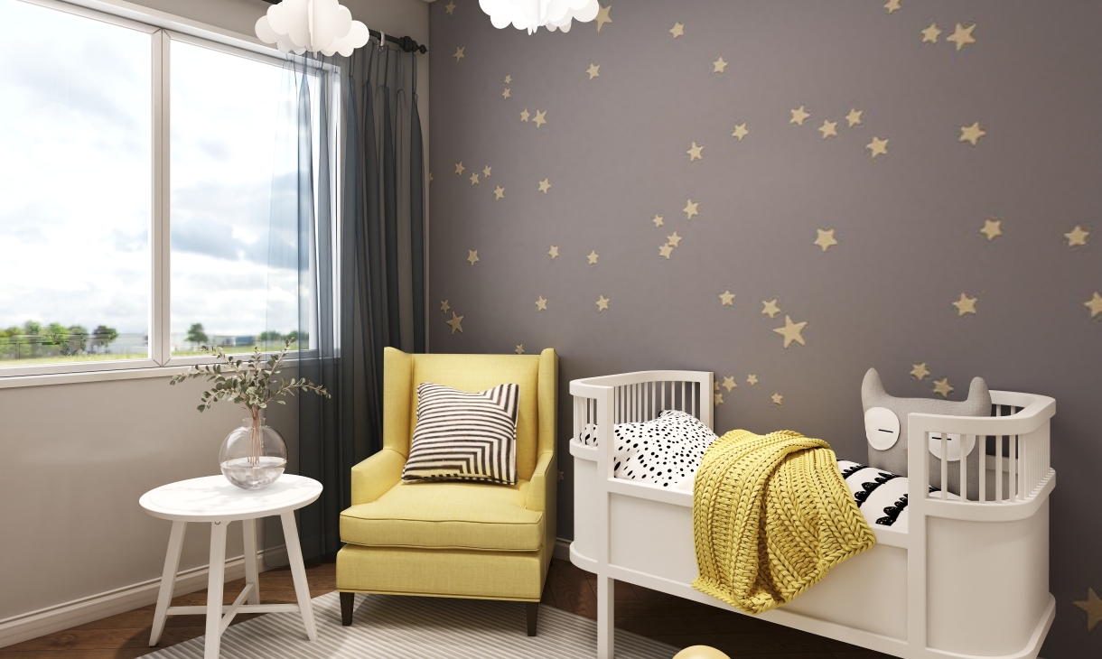 寶寶還在媽媽肚子里,不知道是男寶女寶,用高級灰搭配亮黃,活潑又通用。房間內(nèi)不做固定家具和過多硬裝,只做了簡單的儲物柜和玩具收納。方便以后寶寶長大,改造。 兒童房門做成兩版不同的顏色,臥室里側(cè)做白色,避免沉悶;外側(cè)與其他木門一樣的胡桃色,協(xié)調(diào)一致