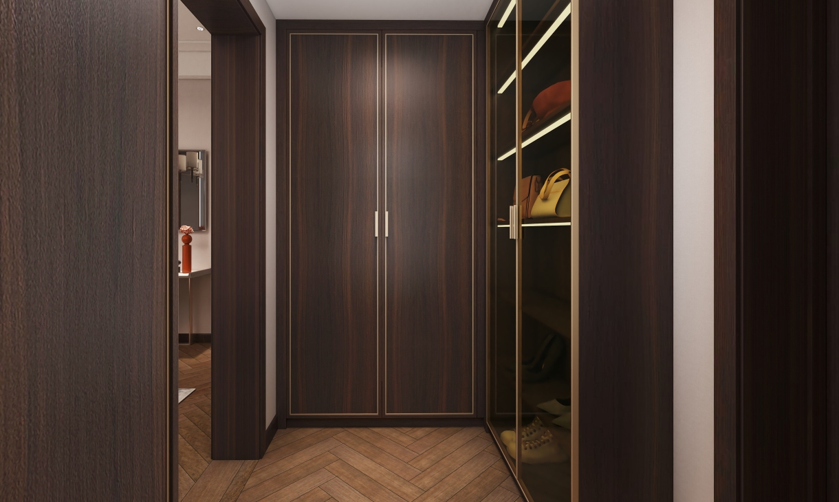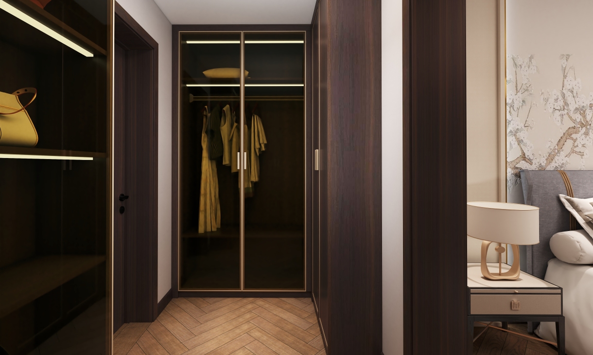 步入式衣帽間,合理分區(qū),方便收納。胡桃木色柜體搭配金屬線條,金屬玻璃門,有遮有漏,防灰塵的同時把雜亂藏起來