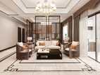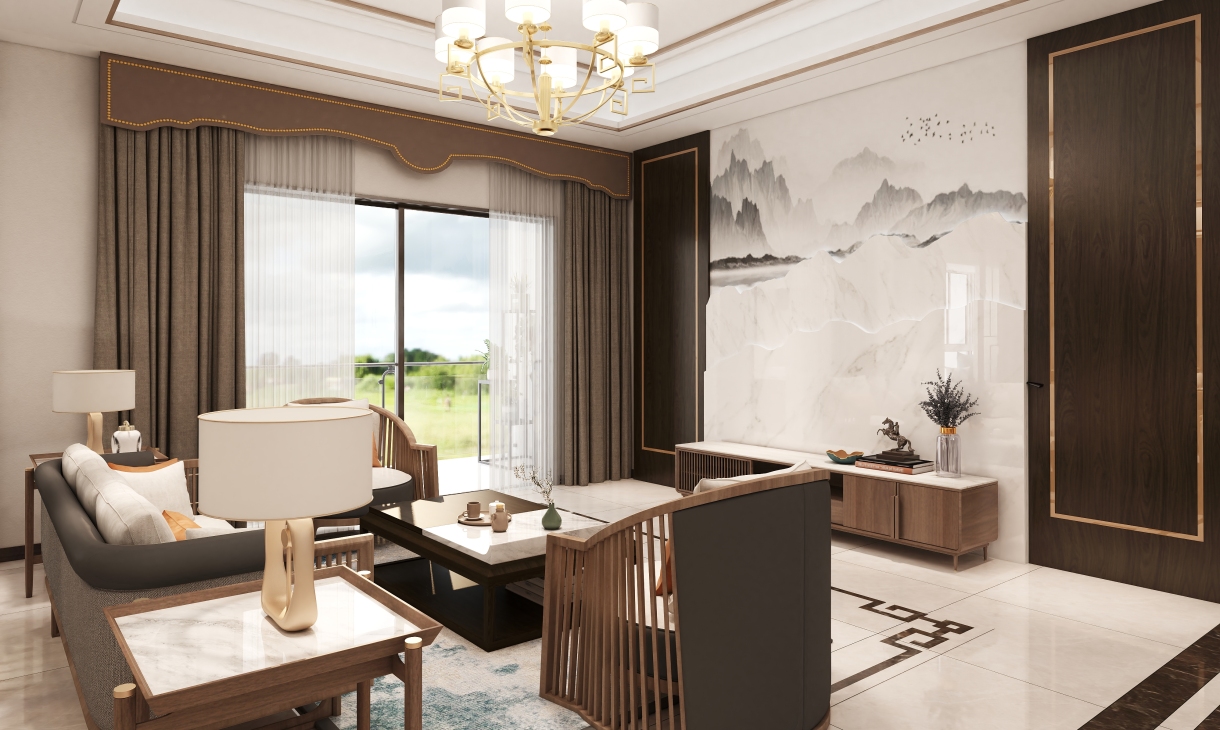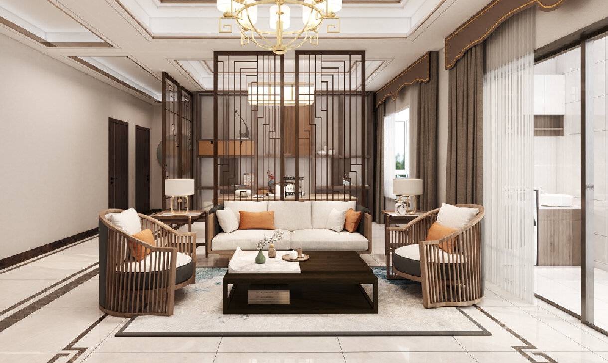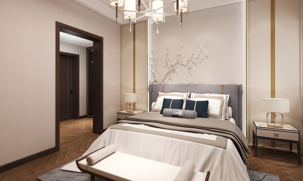 以胡桃色原木為主線,搭配中式拼花,山水,加入理石,金屬元素,點綴珊瑚橘色、煙灰藍,營造溫暖活力的氛圍。客臥木門做成隱形,讓背景墻大氣