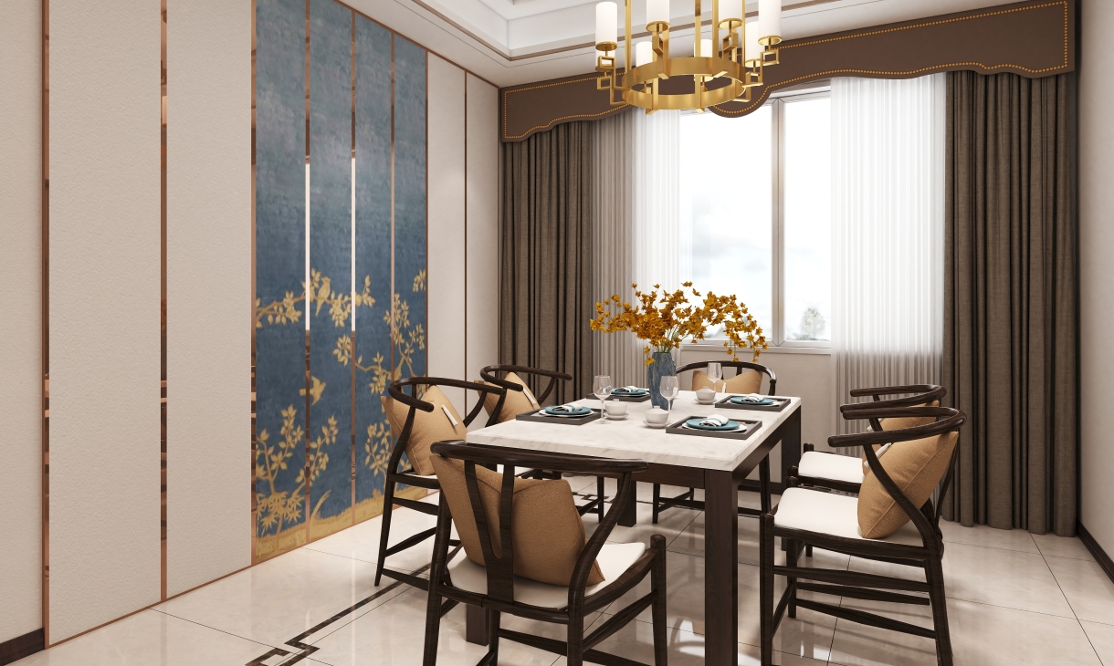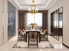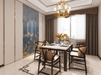 與客廳同款中式元素拼花,背景墻灰藍色點綴橘色花樣,搭配金屬線條,營造溫馨舒適的就餐環(huán)境