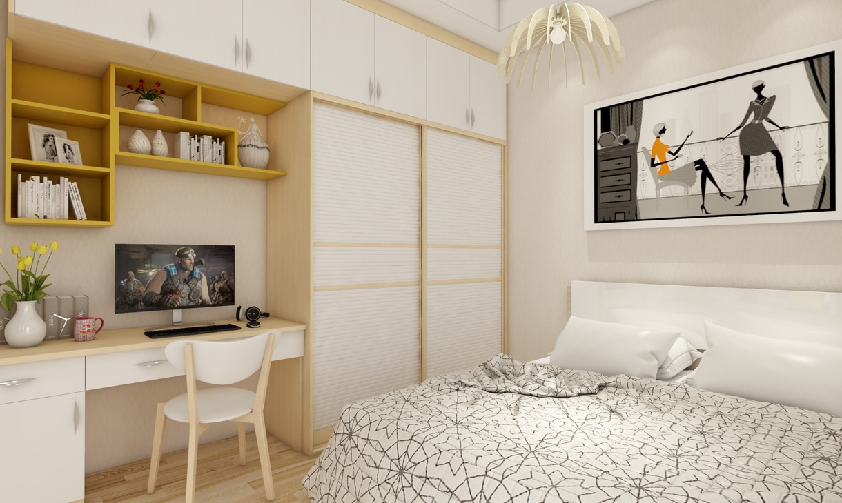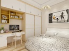 臥室是整套房子中最私人也是最體現出溫馨休閑感的空間,一般在設計時要體現出靜謐舒適的感覺,并且與其他空間明顯的區別。在設計時一般會根據主人的個性要求去設計。在這套方案效果中,臥室以白色這種淡然明亮的色調出現,它的整個面積并不大,整個臥室呈現出一種淡靜的清新感,簡約而素雅。
