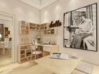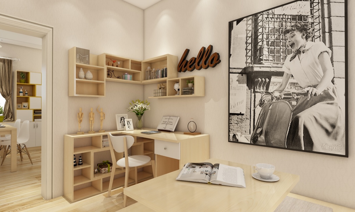 書房十分地簡約,但又不會顯得單調,色調主要白色和原木色,結合裝飾品來點綴又顯得非常文藝,空間布局一般講究線條流暢,整體又顯得十分細膩、有氛圍,書桌椅的功能很強,收納很多小物品,,但是整體構造又不會太雜亂,整個空間顯得特別隨意和溫馨