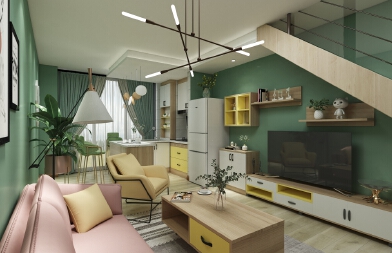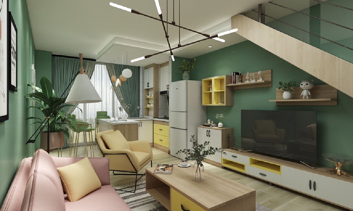 1.開放式廚房 2.主色調(diào)為墨綠色 3.黃色做點(diǎn)綴