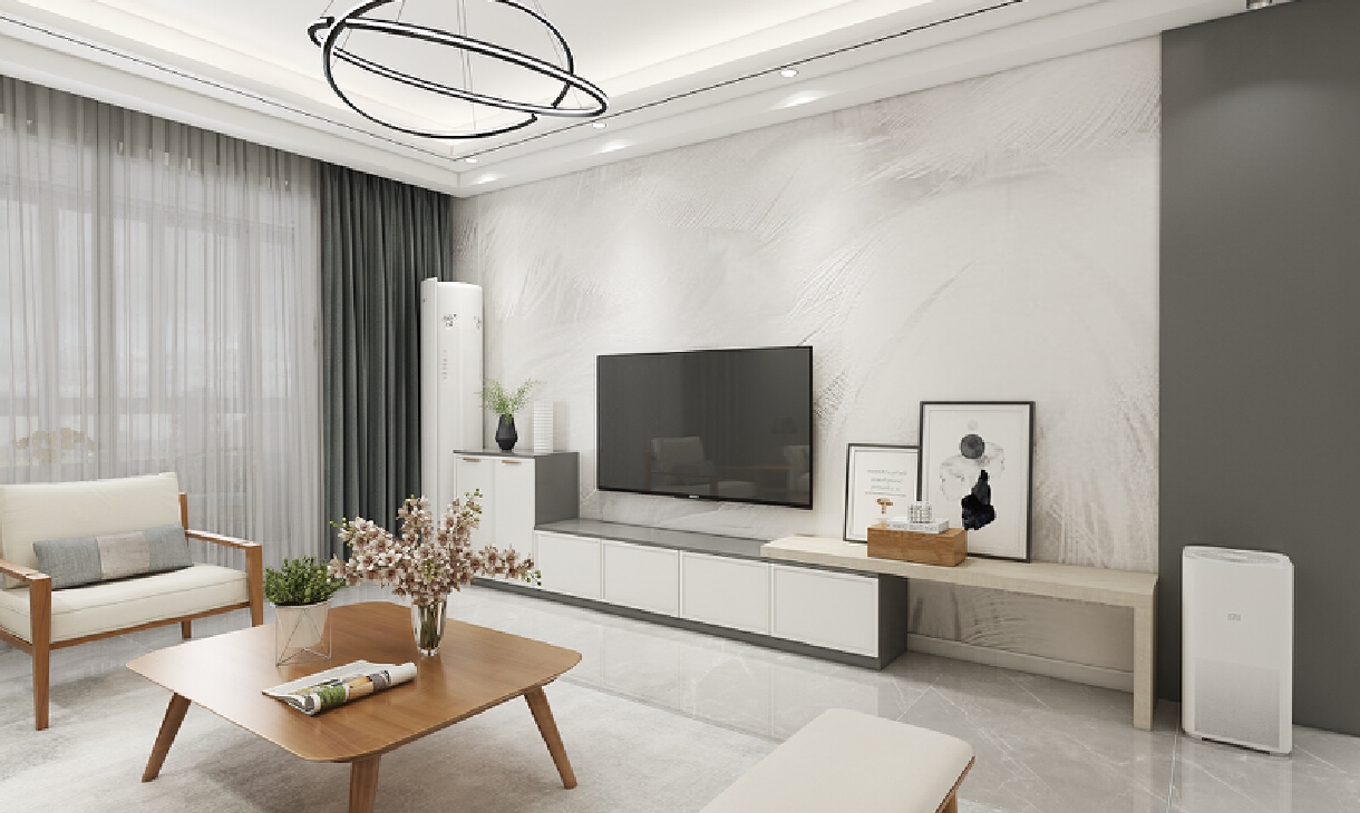 本戶型實際可用面積僅為100㎡,如何在不影響設計與審美的基礎上更大限度的增加儲物空間,是很大的設計難題。設計師巧妙利用廚房埡口等空間加以改造設計酒柜,灰色柜體配以黑色極窄邊玻璃門提升整體檔次,既好看又實用。原木色的玄關柜搭配白色跳色門,整體色調輕盈活潑,既實用又起到裝飾作用。電視背景墻采用淺色的壁畫搭配灰色電視柜,增加整體層次感。