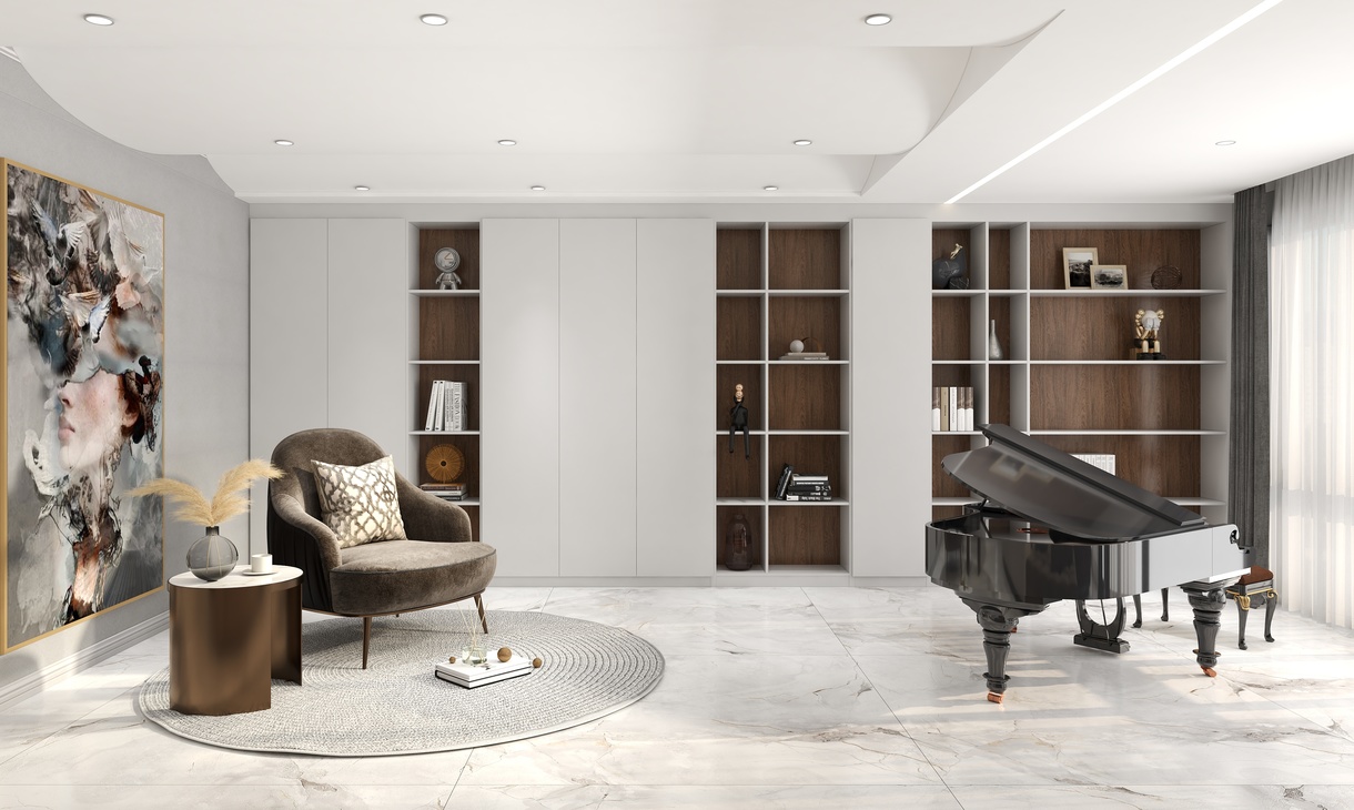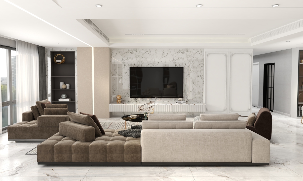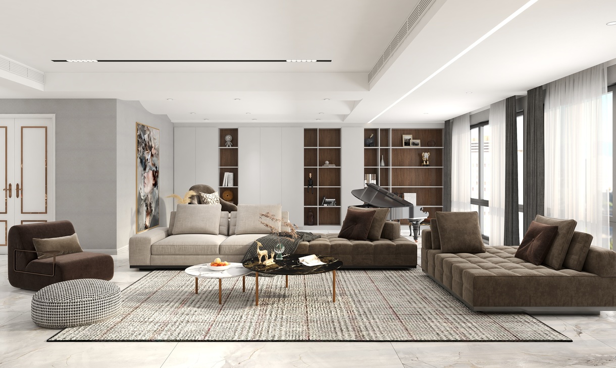 客廳流暢的線條設計,簡約純粹的色彩與細膩的木紋呈現出自然與溫馨氣息,較大的窗戶讓視線更為通透,能給人一種安逸舒適的感覺。簡約大方,流線型的設計帶來時尚與質感。